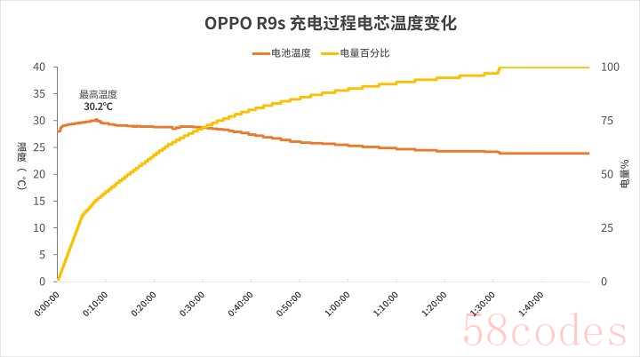 最值得注意的是温度数据,在室温24℃的情况下,在充电前我故意让手机暖暖身子,让电池在自身温度为28℃时开始充电,结果非常令人难以置信:电池最高温度出现在约8分钟时,仅为30.2℃!这样的温度手摸上去甚至连温热感都没有,更别说在R9s这金属背板上,摸起来甚至是冰凉的。