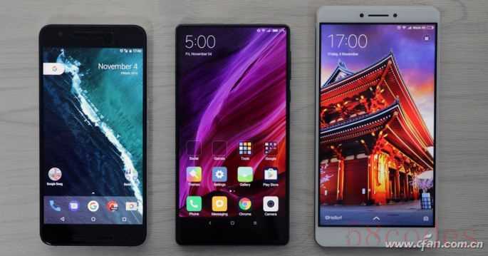5.7英寸的Nexus 6P、小米Mix和6.44英寸的小米Max大小对比