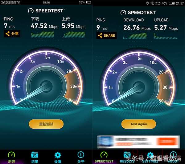 通过在100M宽带下的5GHz信号测试,当OPPO R9s与路由器位于同一房间时,下载速度可以达到93Mbps,基本上可以达到路由器下载速度的上限。而在相距较远的另一个房间内,下载速度也可以达到47.52Mbps,相当于50M宽带的网速。相比之下,同一位置的另一款手机的下载速度只能达到26.76Mbps。