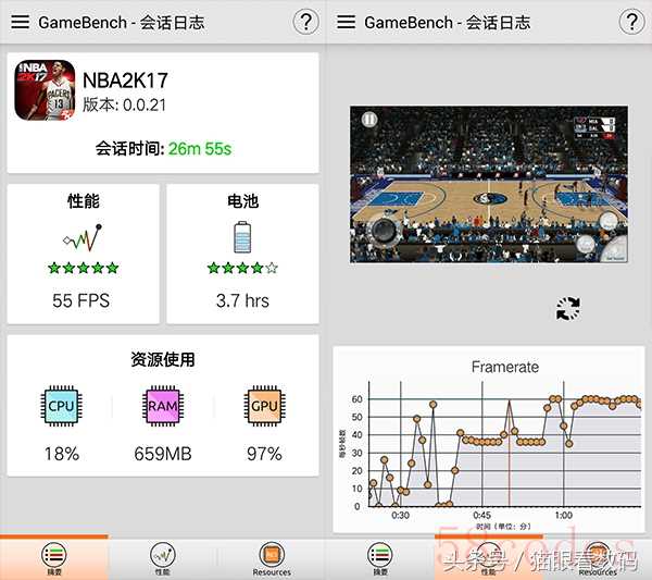 通过GameBeach的监测可以看到,OPPO R9s在运行NBA2K17时,平均帧率可以达到55FPS,CPU资源消耗仅为18%,内存(RAM)占用659MB,GPU资源消耗97%。可以看出类似的3D游戏主要还是考验GPU的性能。