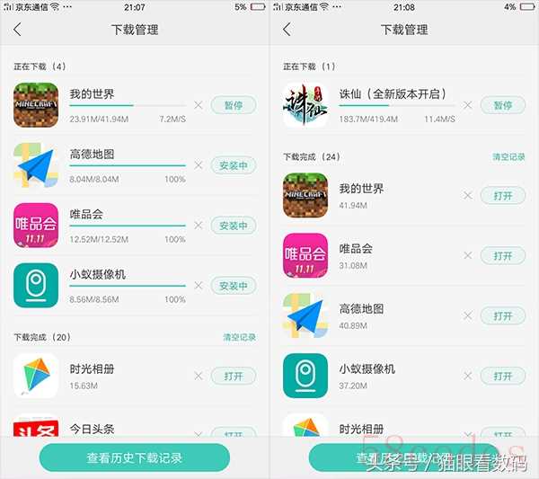 从自带的应用商店下载软件时,下载速度基本上可以保持在7M/S左右,峰值可以达到11.4M/S。在信号良好的情况下,OPPO R9s可以充分发挥出百兆宽带的下载速度,尤其是在5GHz频段下即使距离路由器较远也能够保证质量较高的网络连接,这一点比其它品牌的手机要好很多。