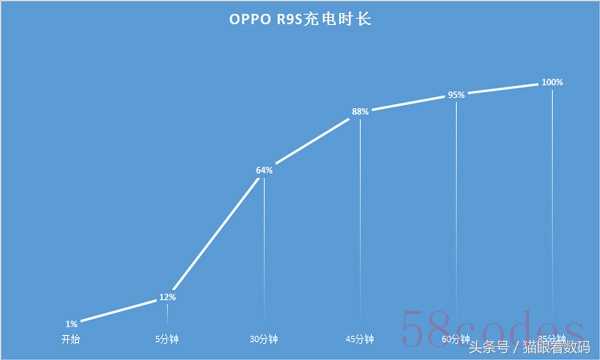 如上图所示,OPPO R9s从1%的电量开始充电,5分钟可以充至12%,30分钟达到64%,45分钟达到88%,60分钟达到95%。完成整个充电过程大约需要85分钟的时间。如果充电时间不够的话,仅需30分钟就可以获得一整天所需的电量。