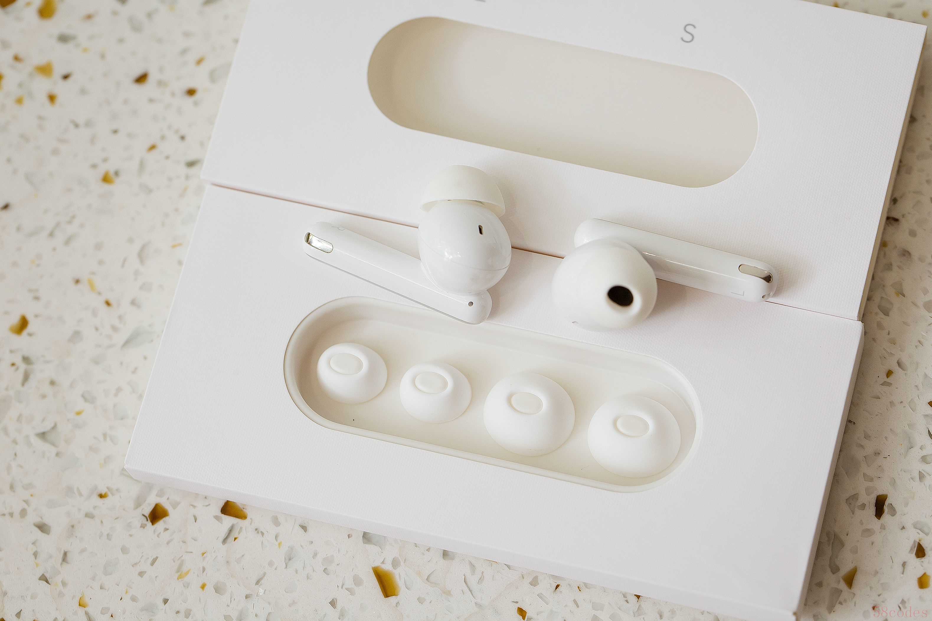 打开包装,里面的内容物包含了耳机盒、耳机本体、额外的两组耳塞、一根充电线以及说明书和保修卡。
