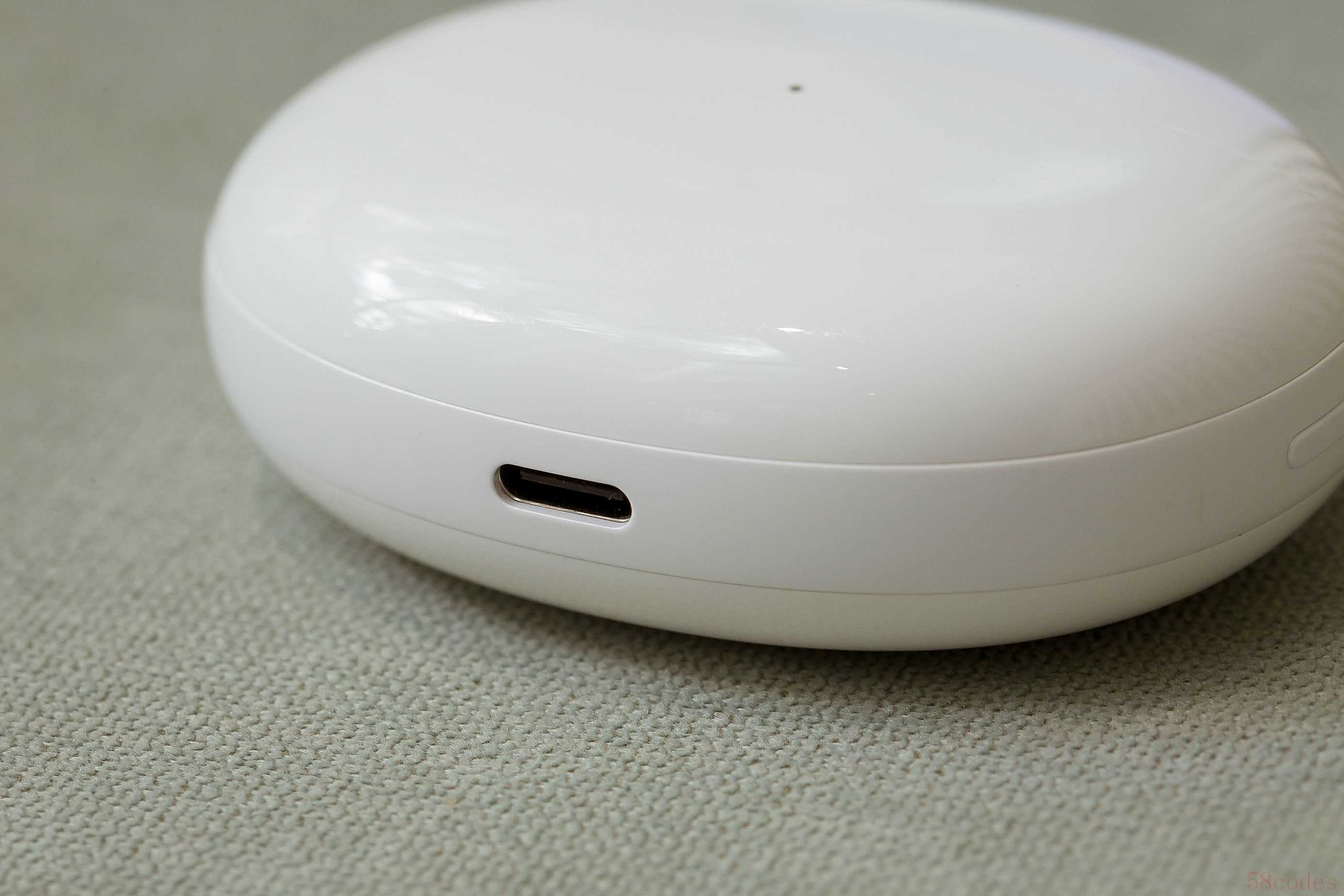 耳机盒的底部正中央是USB-C充电口,还有一条磨砂质感的装饰条贯穿了腰线,这一点同样与OPPO Enco X很相似。磨砂质感的装饰条在视觉和触感上都与亮面的整体有一定区分,为整体设计增添了一分精致感。