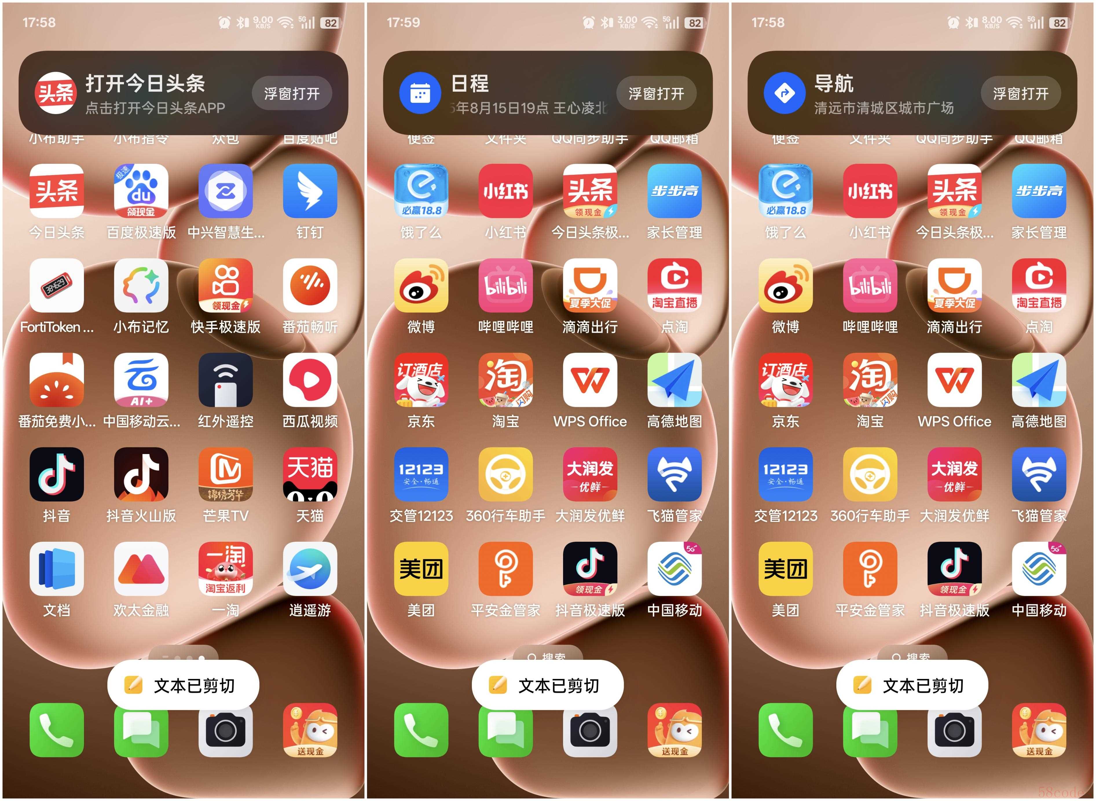 其实「剪贴板」这块「风水宝地」,不仅被用户和众多App轮番使用,就连ColorOS 15也准备「物尽其用」,从而跳过中间步骤实现一步到位。系统通过内置的「流体云」,自动识别「剪贴板」当前的内容。如果包含抖音、快手、小红书、京东、淘宝、今日等App连接,便能在屏幕顶部限时开启「传送门」,点击便能跳转到指定页面。如果包含本地的详细地址,便能在屏幕顶端出现导航提醒,在设置默认的导航App后便能一键跳转。如果包含详细的时间等信息,便能在屏幕顶端出现日程提示,点击便能跳转至「日历」,并智能放置在该待的地方,无需过多改动便能创建。同一个动作便能跳转到不同的分支,既智能又便捷还好用。
