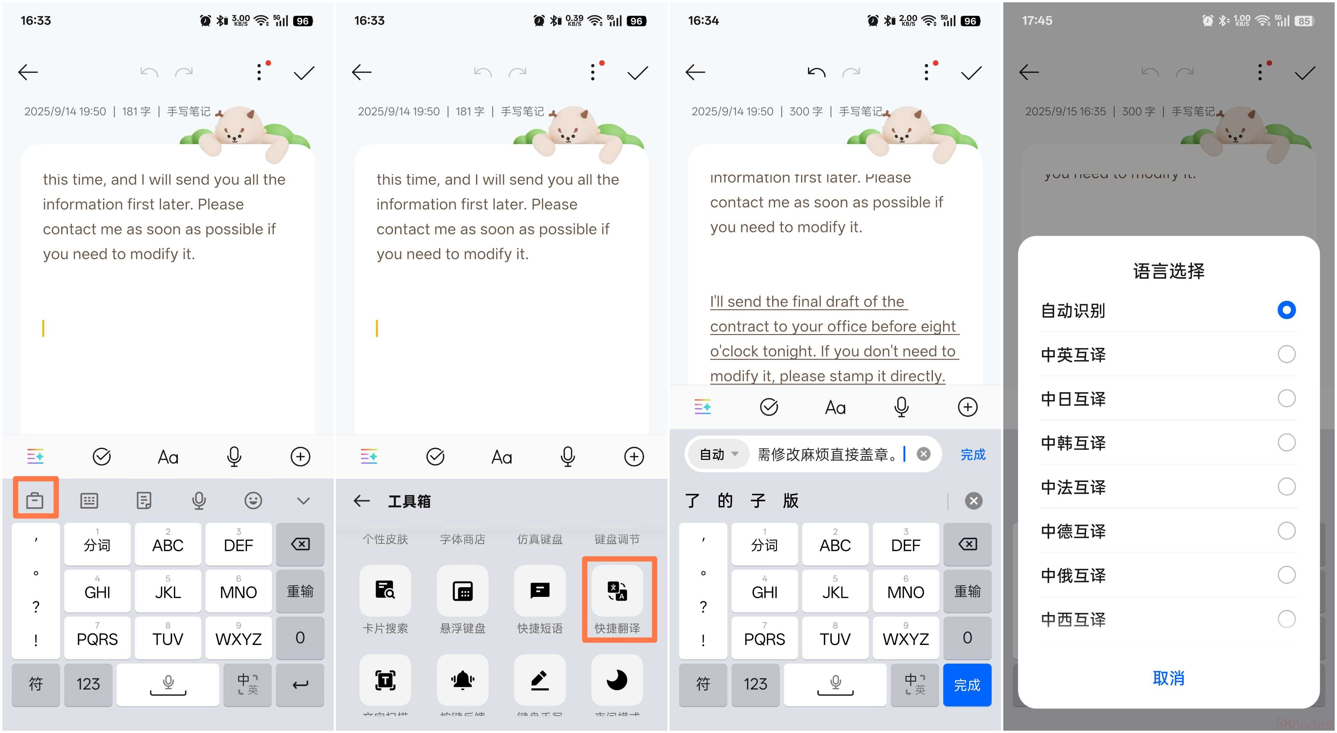 随着科技与网络的持续发展,人与人之间的交流变得越来越便捷。如今不少境外游的价格甚至与国内相差不大,如果有条件适当出去走走,看不一样的山河,体验不一样的风土人情,对当前的生活有更清楚的认知。有机会甚至还能和当地人交上朋友,实现儿时与「李华」写信的梦想。随着市面上众多软件「走出国门」,即便回来后也能实现与对方随时随地交流。如果双方还存在一定的时差,最好选择文字交流比较合适。然而除了从小就学的英语,还有更多我们从未接触过的外语,可不是短时间就能精通的。适逢碰上双方同时在线,如果话题一旦聊开,依然还得在翻译软件先「过堂」,难免对双方沟通的「流畅性」造成影响。ColorOS 15自带输入法支持「快捷翻译」,使用聊天软件交流时,只需在对话框输入中文,便能实时翻译成指定的文字,支持中英、中日、中韩、中法、中俄等语言互译,避免对方再翻译一遍,从而提升双方的交流效率。如果对方没有趁手的翻译工具,也能直接输入外语,我们这边可用「自由翻译」直接打破这层障碍,从而省时省力又省心。
