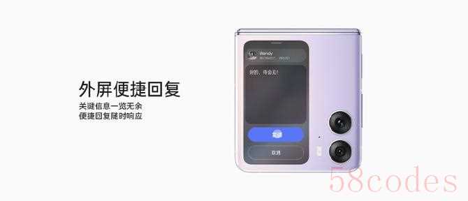 据统计,用户每天点亮手机次数平均高达80次,这意味着上下形态的折叠屏每天要进行至少八十次的开合,而大部分的亮屏都是为了进行信息回复。而Find N2 Flip的出现将让手机变得更具寿命,用户使用Find N2 Flip外屏就能用一键回复功能,支持系统短信、微信等通讯App,可以实现omoji、快捷短语、语音转文字多种回复形式。