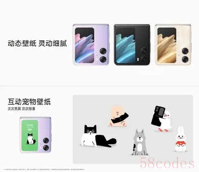 而对于外卖、打车、音乐类应用,Find N2 Flip支持内外屏接力功能,用户只需合上手机,关键信息就会在外屏显示,可随时查看服务进展,不必反复展开手机。 值得一提的是,Find N2 Flip还提供了个性化方案,内置5种专属萌宠壁纸,每套壁纸拥有15个互动动作。互动宠物可以和系统状态巧妙联动。用户在不同场景下,通过点亮外屏或触摸宠物身体,即可得到互动反馈。例如在充电时能看到宠物健身;在播放音乐时,宠物也会戴上耳机听歌,电量少于15%时,宠物便会呈现疲惫状态,这样的设计能满足用户的个性化需求。 不仅如此,Find N2 Flip还支持外屏自定义壁纸,可将GIF图设置为锁屏的动态壁纸,打造个性化外屏,让Find N2 Flip成为你的专属饰品。主题商店也提供了丰富的外屏小游戏壁纸,用户可以随心选择并设置到外屏,手机秒变掌上游戏机。