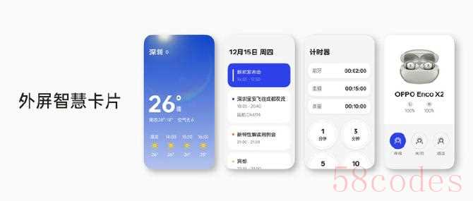 Find N2 Flip的外屏支持系统级功能,其中的外屏卡片提供了日程、天气、相机、计时器、耳机等基础功能,用户无需展开手机,即可随时拍照、查看天气、日程管理、购物支付、调节耳机等,甚至还可使用外屏快速刷视频,丰富外屏使用场景,服务一触即达。