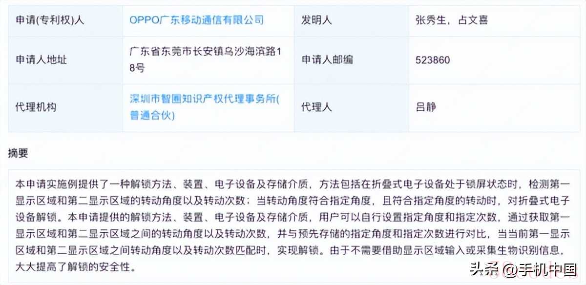 而这一专利的出现,也正式宣布将有全新的手机解锁方式。简单来说,就是在使用OPPO折叠屏手机时,在手机屏幕开合角度达到一定指定位置时且手机开合次数达到指定要求后,手机能够自动解锁。这样的解锁方式,将大幅提高手机解锁的安全性。