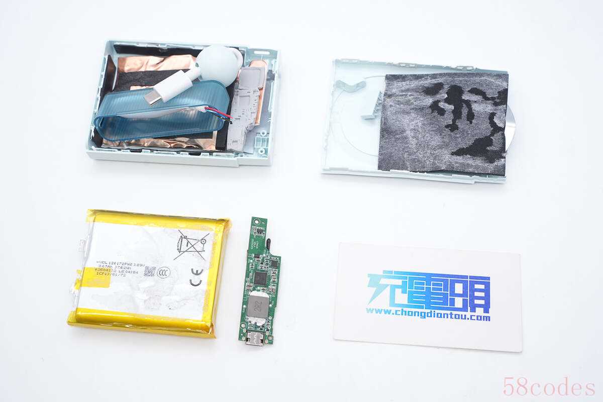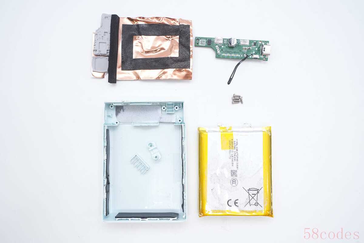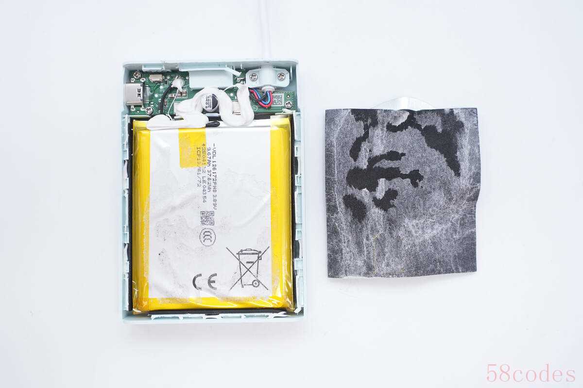 拆下电芯以及PCB板,下方区域还设有散热铜箔以及导热垫。