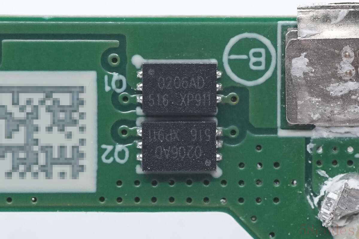 两颗锂电保护管来自CRM祥瑞微,丝印0206AD,实际型号为CRMVATU0206AD,双NMOS管,耐压20V,导阻6.7mΩ,采用DFN2x3-6L-D封装。