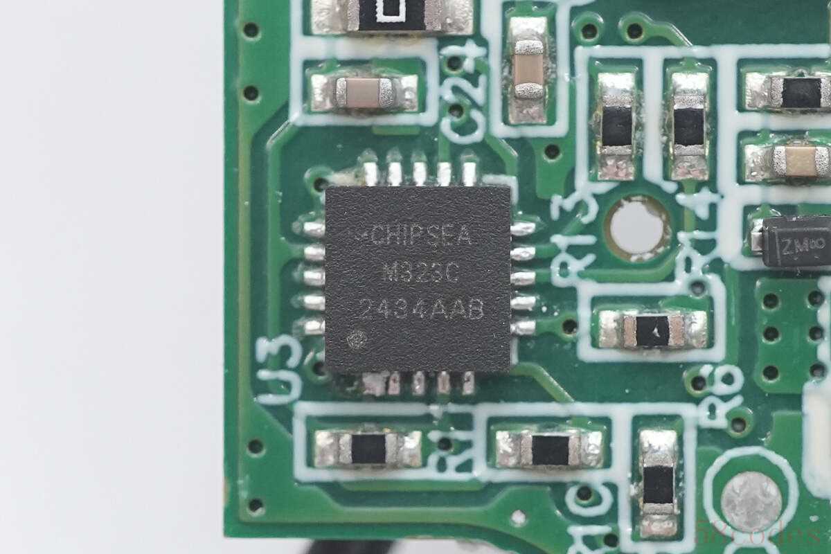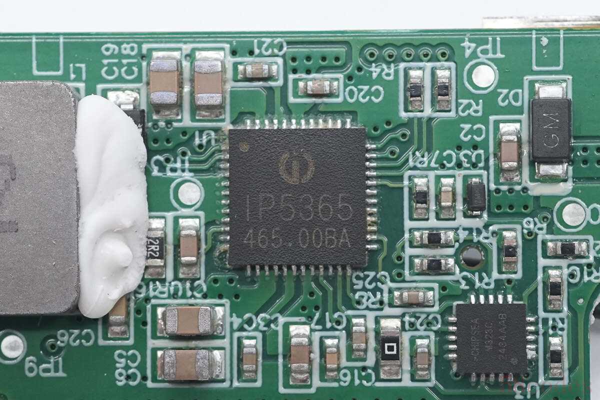 移动电源SOC芯片来自英集芯,型号IP5365,芯片具备两个USB-C接口输入和输出,一个USB-C接口或USB-A口输出,一个USB-A口输出,共计支持三路USB-C接口,且任一接口均支持快充。芯片支持PD3.0快充,PPS快充和UFCS融合快充,支持AFC、FCP、SCP、QC2.0/3.0快充协议,并集成Lightning输入通信。
