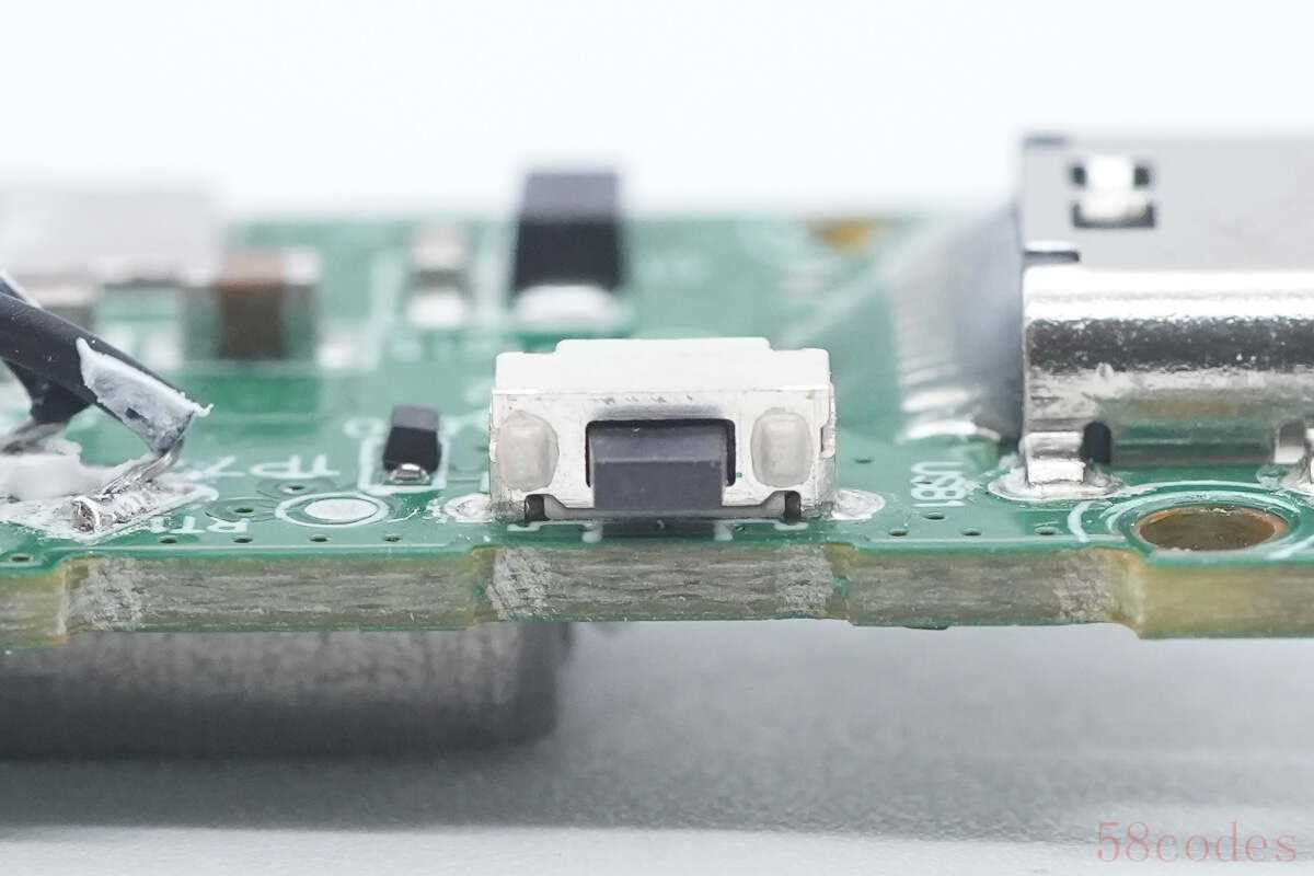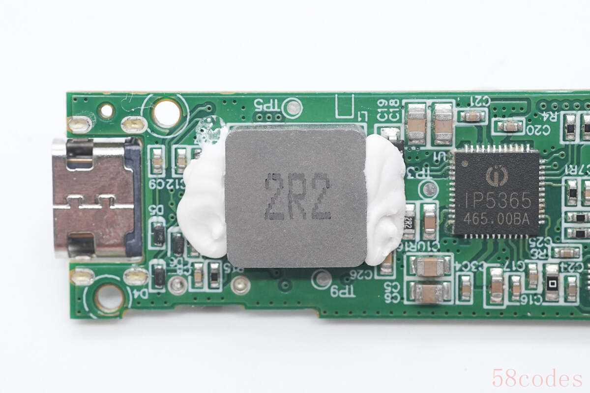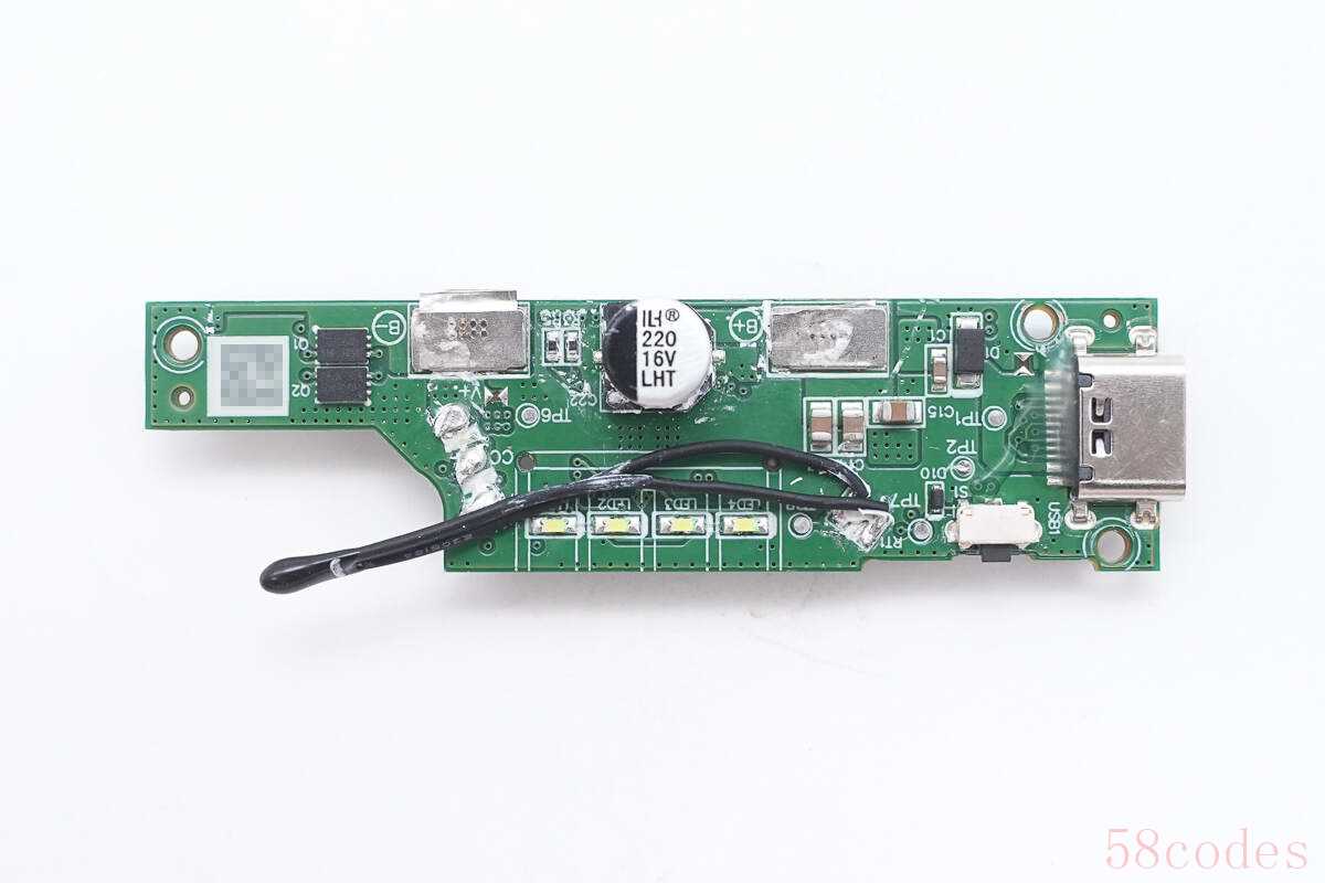 将PCB板正面白胶清理掉,板子上设有锂电保护管、滤波电解电容、热敏电阻、LED指示灯、电源键等,USB-C接口母座打胶水加强保护。