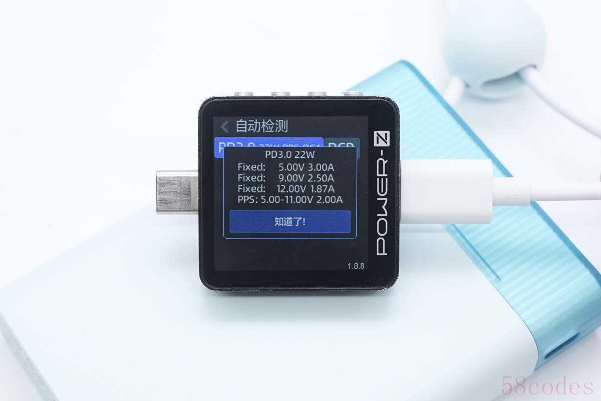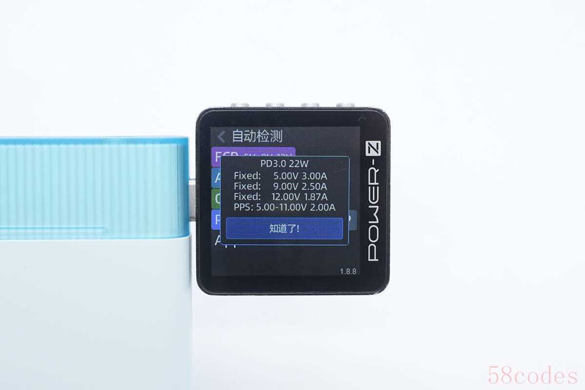 PDO报文显示USB-C口还具备5V3A、9V2.5A、12V1.87A三组固定电压档位,以及5-11V2A一组PPS电压档位。