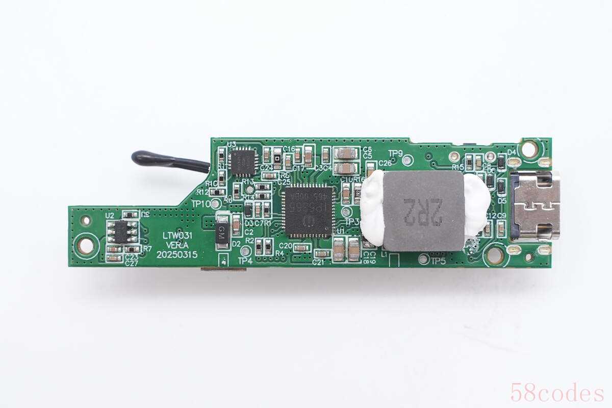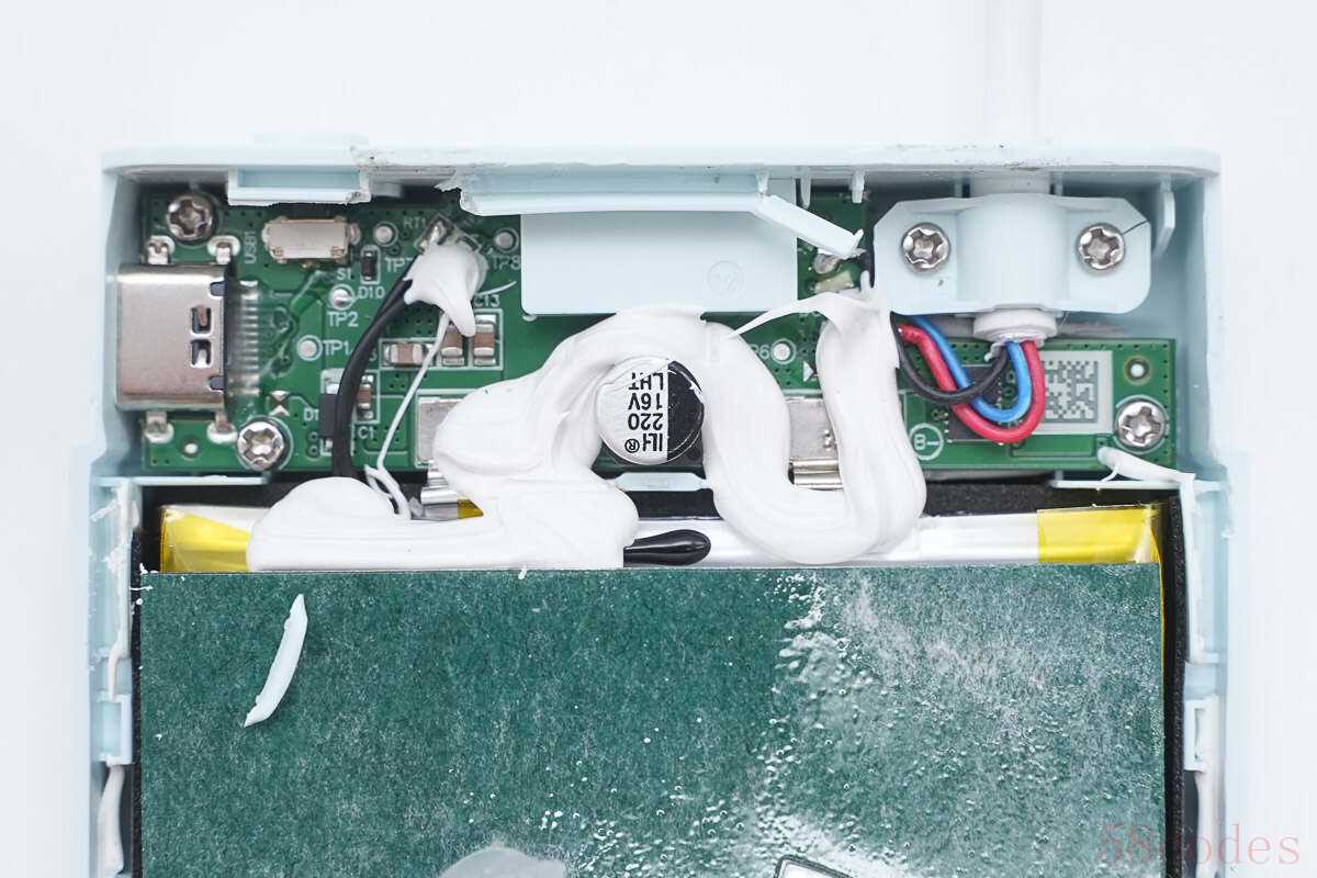 内部PCB板以及USB-C自带线通过螺丝进行固定,热敏电阻、电容等打胶加固,电芯与PCB板通过镍片点焊连接。