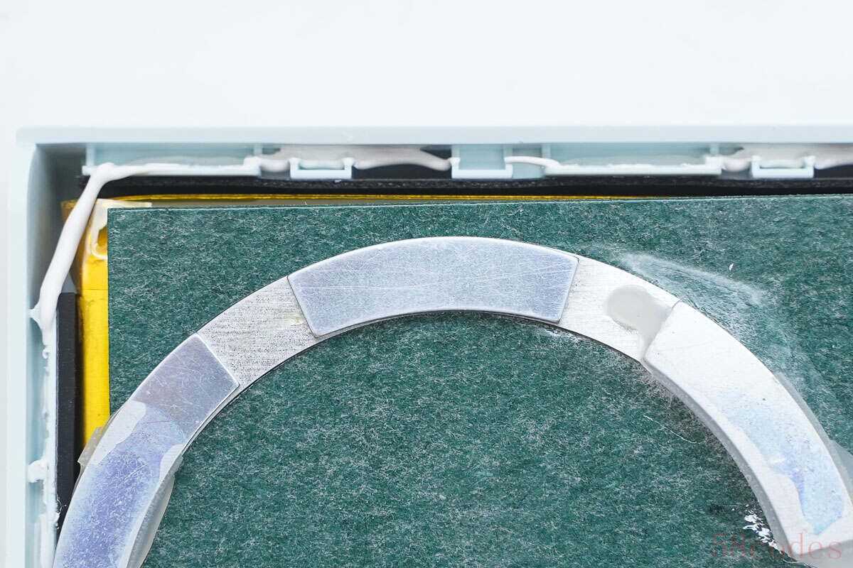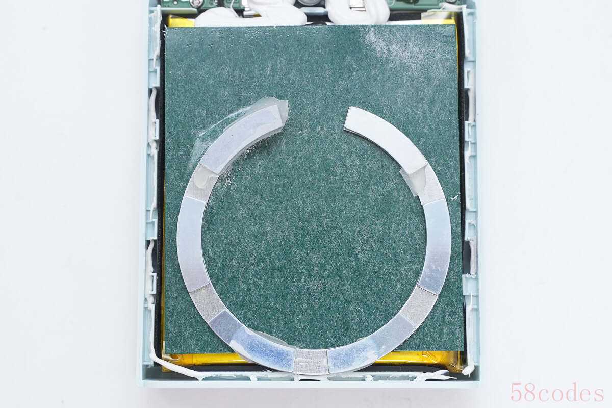 电芯与壳体之间填充缓冲泡棉进行保护,磁铁环打胶水固定。
