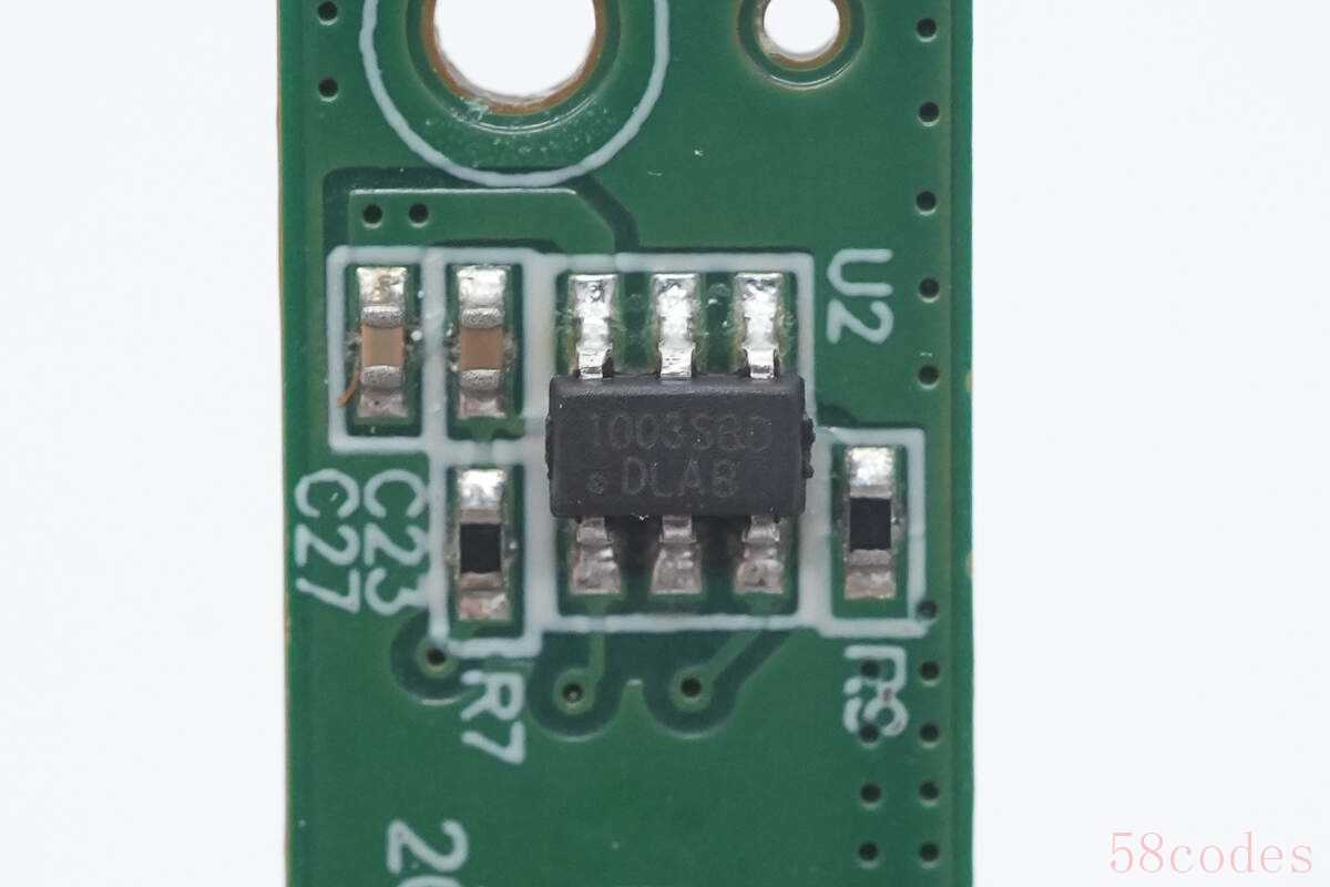 锂电池保护芯片来自创芯微,丝印1003SBD,实际型号为CM1003-SBD,是一颗单节锂电池保护芯片,支持高压锂电池应用,过充电保护电压为4.475V,具备20mV精度,过放电保护电压为2.76V,精度为50mV,采用SOT23-6封装。