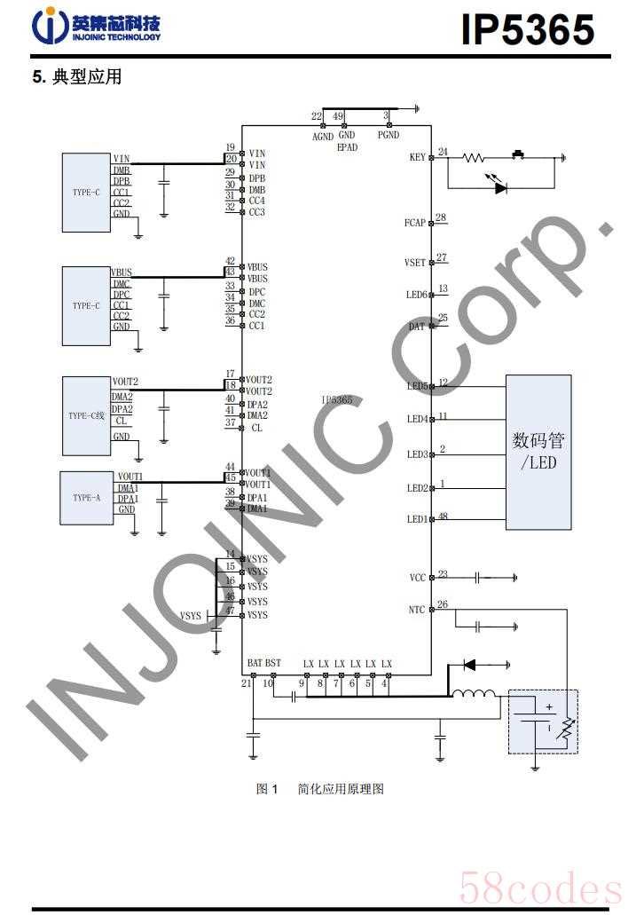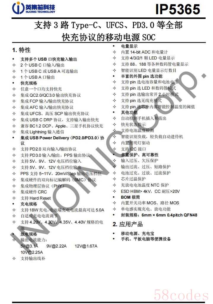 IP5365支持18W快速充电,电池端充电电流可达5A,支持4.2V、4.3V、4.35V和4.4V电池应用。芯片内置开关功率MOS、路径MOS,内部集成14位ADC,支持1-4灯LED电量显示,支持88或188数码管电量显示,支持自动开关机,集成输入过压、欠压保护,输出过流、过压、短路保护,电池过充、过放和过流保护,芯片内置过热保护,并支持外接NTC进行电池温度保护。