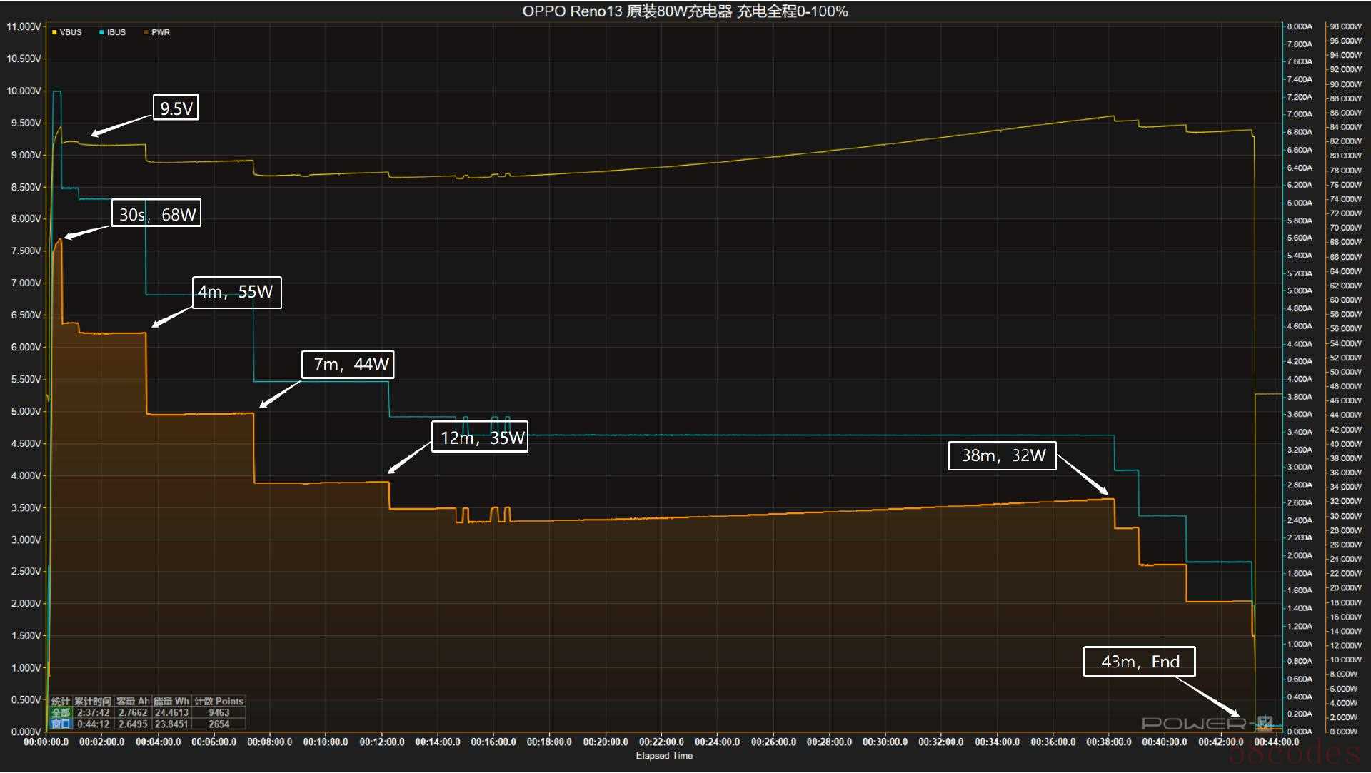接通电源后,握手9.5V电压档位;前30秒充电功率最高达到68W;随后功率下降至55W左右并持续充电至第4分钟;随后功率下降至44W左右并持续充电至第7分钟;随后功率下降至35W左右并持续充电至第12分钟;随后功率下降至32W左右并持续充电至第38分钟;之后功率呈阶梯式下降,并于第43分钟充至满电。