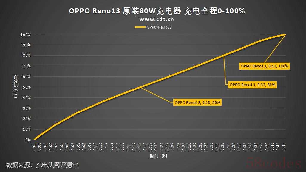 绘制出折线图,可以清楚看出使用原装80W充电器为OPPO Reno13手机 18分钟充至50%;32分钟充至80%;从0%开始至完全充满耗时约43分钟,对于5600mAh大电池来说充电速度表现不错。