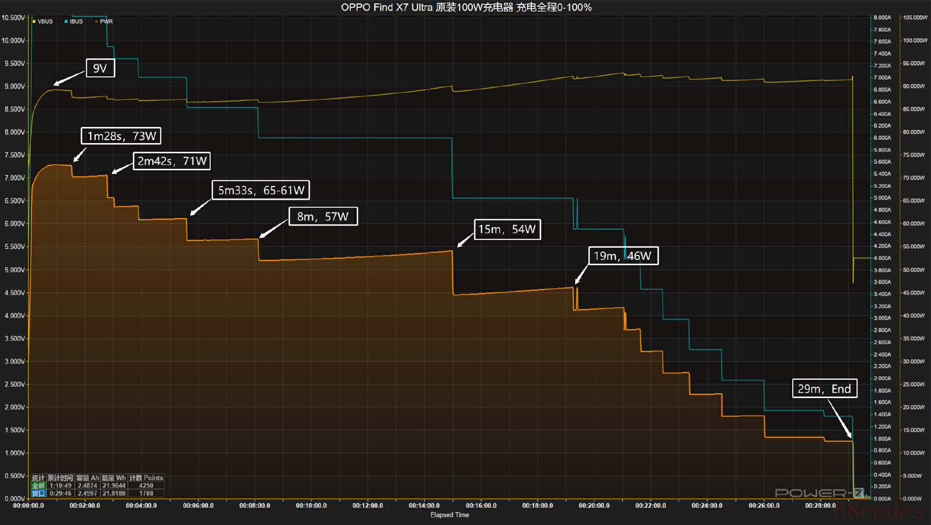 "测试目标:" 评估 OPPO Find X7 Ultra 在 100W 超级闪充下的实际充电表现,特别是从空电到 100% 的时间,以及充电过程中的电压、电流、温度等关键参数变化。