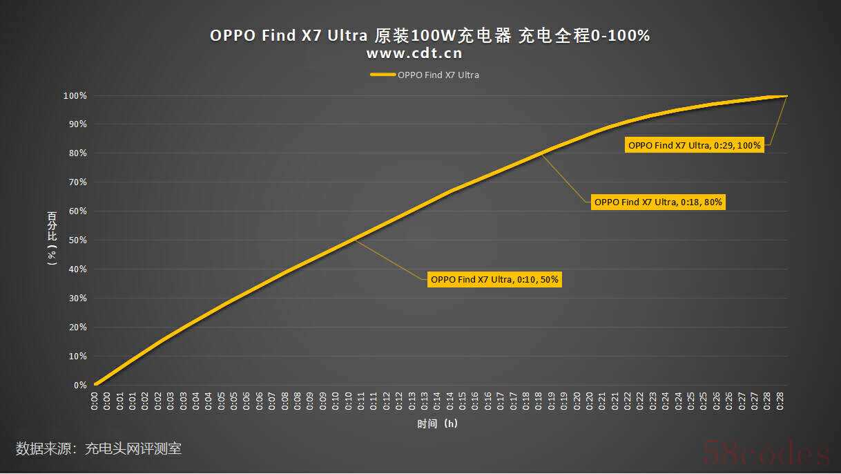 我们来模拟一次 OPPO Find X7 Ultra 配备 100W SuperVOOC 超级闪充和 5000mAh 电池的充电全程测试。