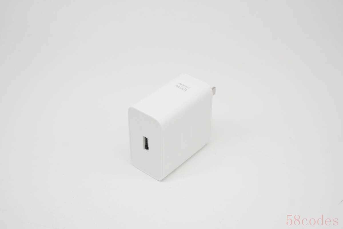 OPPO 100W 充电器 采用 PC 阻燃外壳材质制作,机身为纯白配色,外壳光滑亮面;输出端面板配置单USB-A端口。
