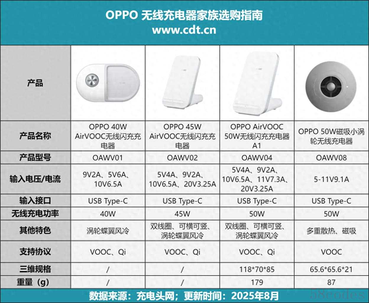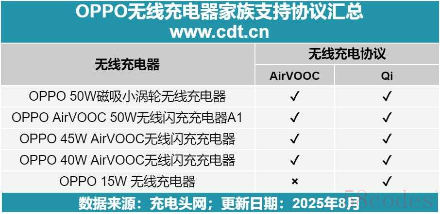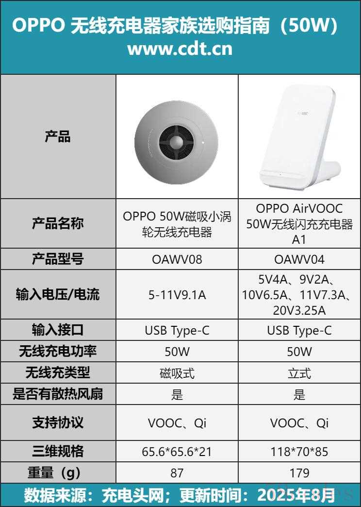 在同家族列表里OPPO 50W 磁吸小涡轮无线充电器拥有配置全面的AirVOOC和Qi无线充电协议,为主流配置。