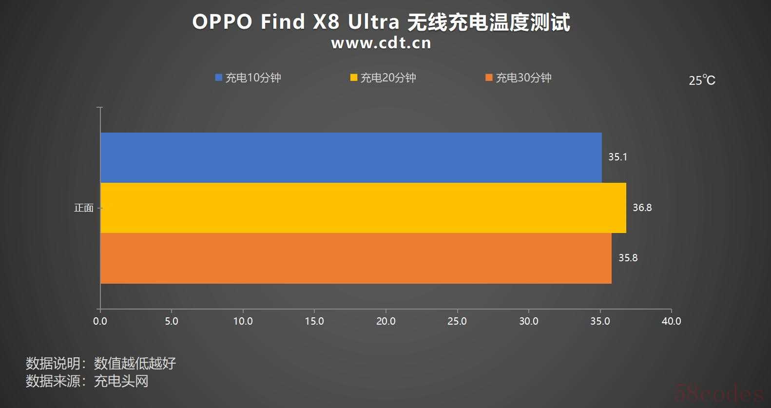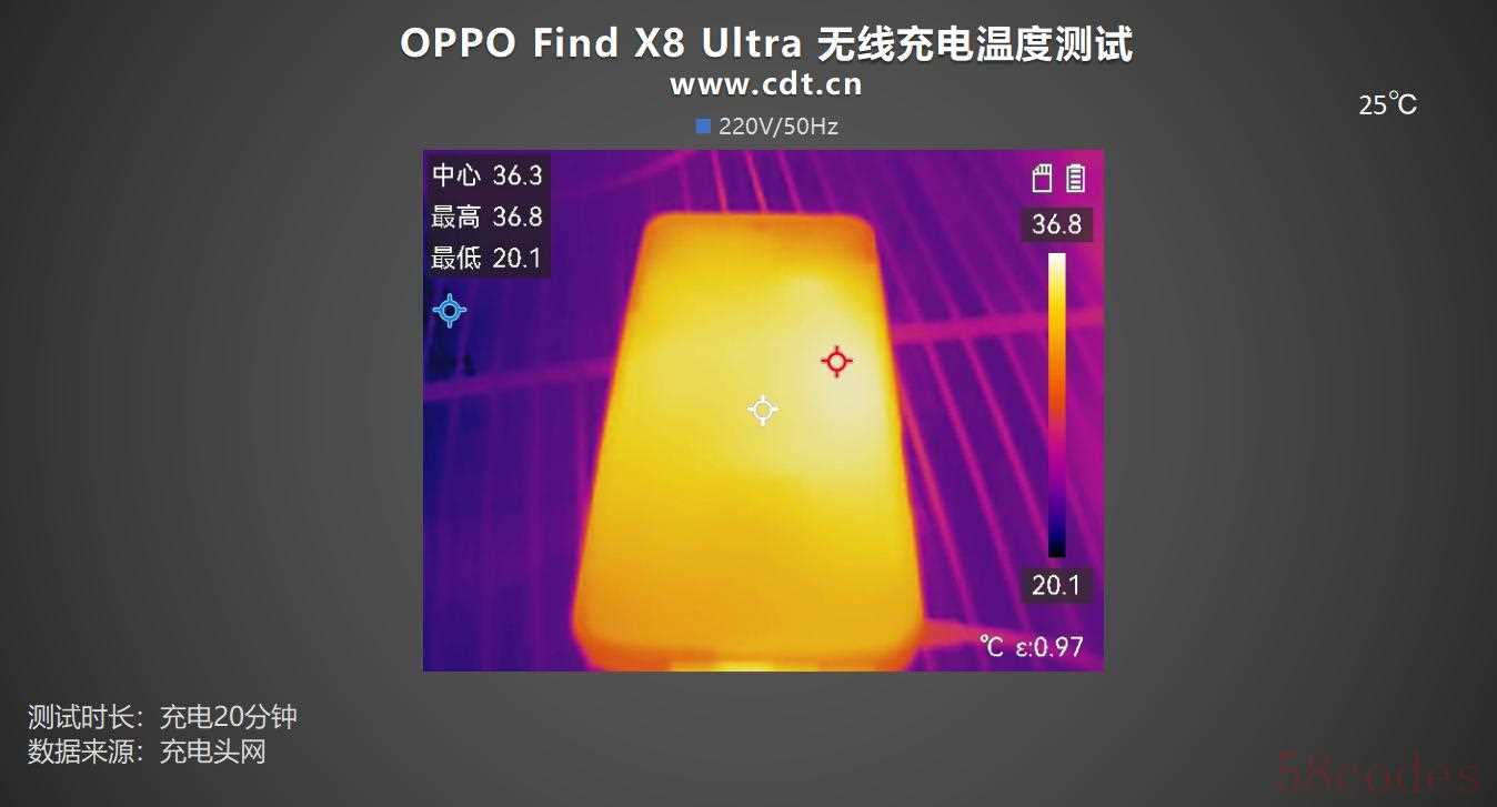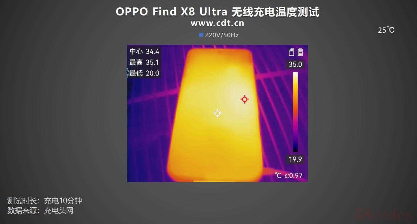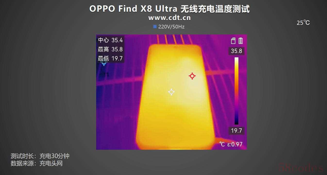 充电器是一种转换设备,充电过程中会有损耗,以热量的形式散发出来,所以充电器会发热。下面来看看OPPO AIRVOOC 50W 磁吸无线充电器的充电温度表现如何。将产品放在25℃的恒温箱中,使用OPPO AIRVOOC 50W 磁吸无线充电器为OPPO Find X8 Ultra充电,热成像仪分别采集15分钟、30分钟、45分钟手机与无线充的接触最高温度。