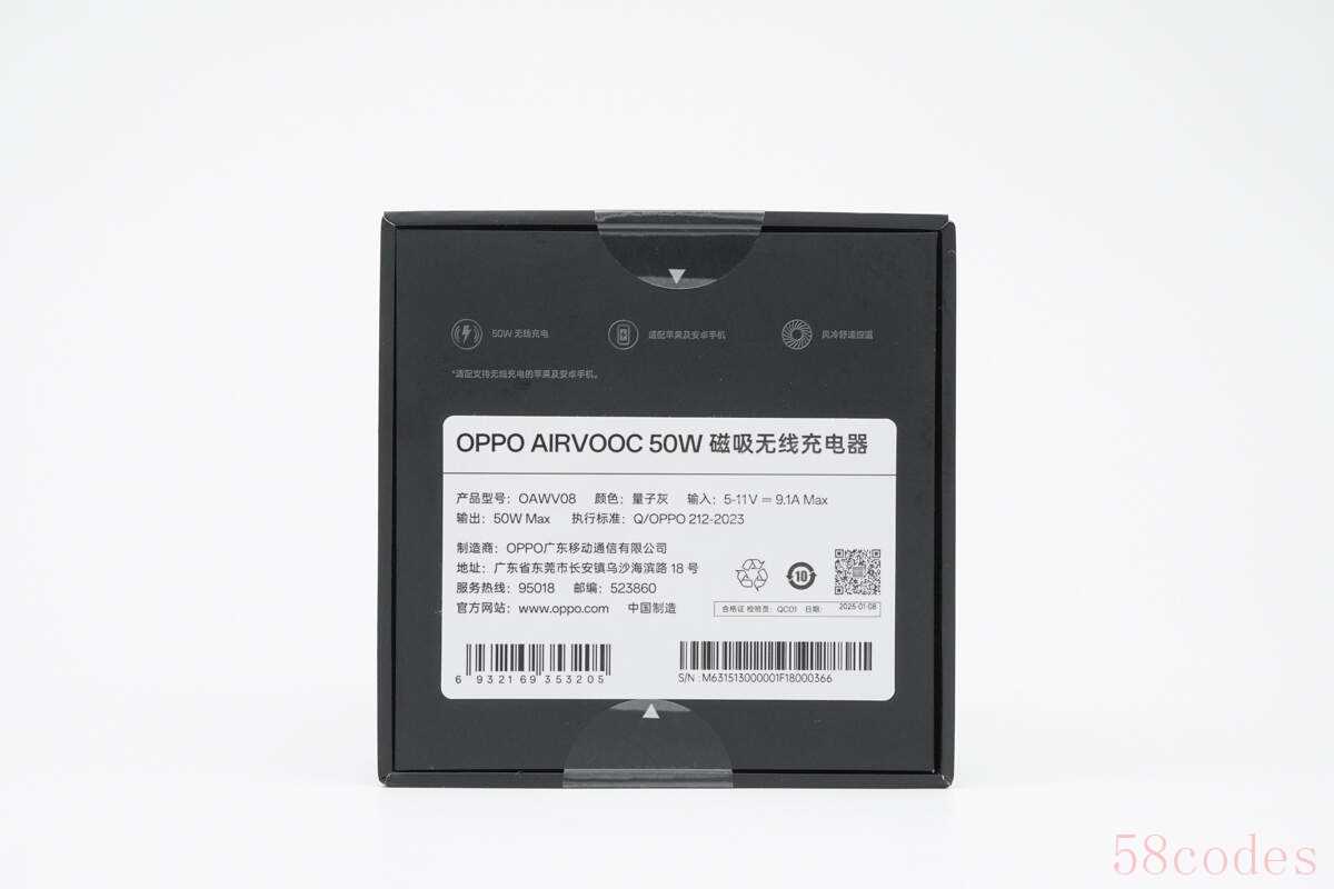 包装盒背面上方印有产品名称:OPPO AIRVOOC 50W 磁吸无线充电器,以及产品参数。
