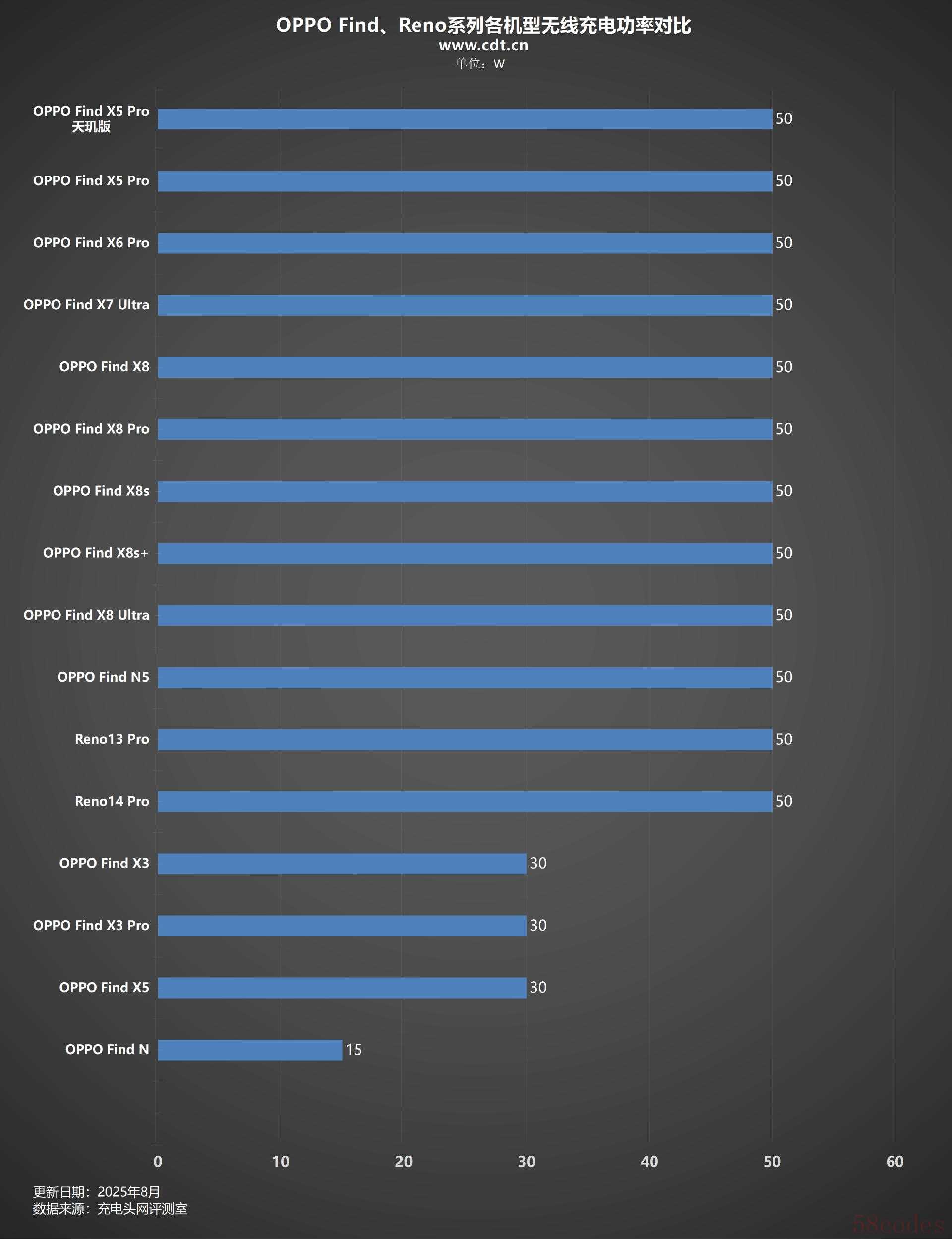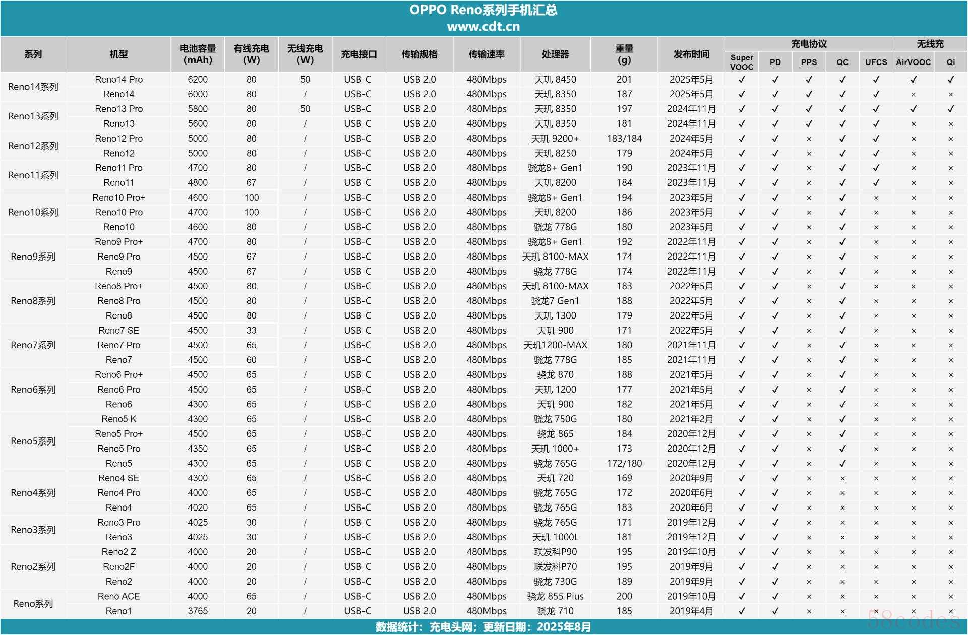 主打轻薄的OPPO Reno系列中,仅有Reno13 Pro和Reno14 Pro搭载50W无线充电,机型相对较少。