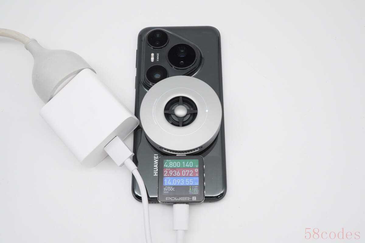 为 华为Pura80Pro+ 充电时,OPPO 50W 磁吸小涡轮无线充电器输出端功耗约为 4.8V 2.94A 14.09W。