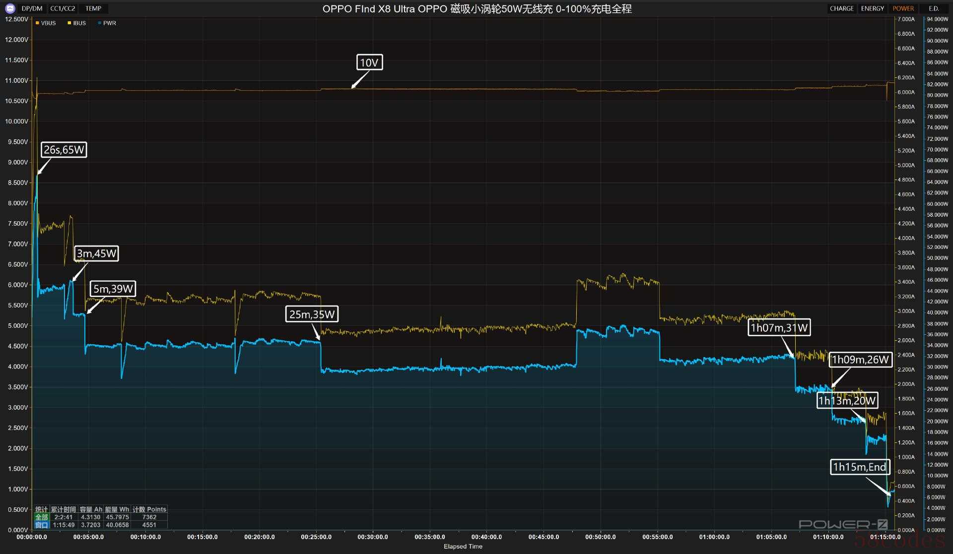 接通电源后握手10V电压,最高功率可达65W随后下降至45W左右,3分钟后下降至39W,2分钟后功率再次下降至35W左右,维持了20分钟,随后下降至31W左右,维持42分钟左右,期间有5分钟短暂爬升回39W,随后功率呈“阶梯”式下降,最终于1小时15分钟完成充电。