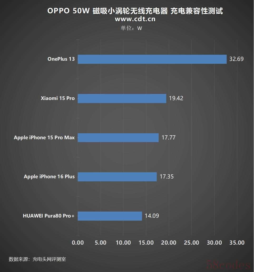 将兼容性数据汇总,同属OPPO绿厂的一加13充电功率达到32.69W,表现最佳,其余安卓、苹果机型充电功率在14-20W,除去风扇+制冷片功率,实际充电功率约为7-10W。