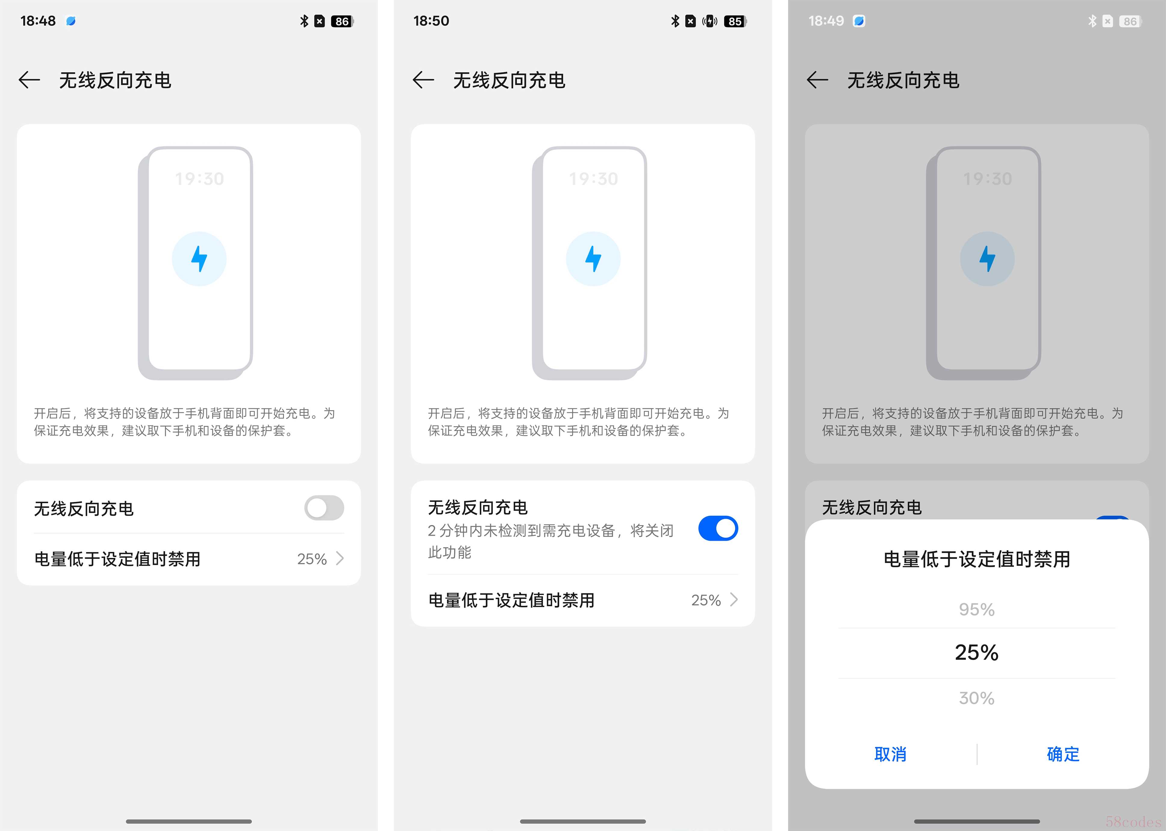 同时这款手机也支持反向无线充电功能,在【电池】设置页面中拥有开关选项,当有设备充电时在状态栏会有提醒。同时可设置电量低于设置值时禁用该功能。
