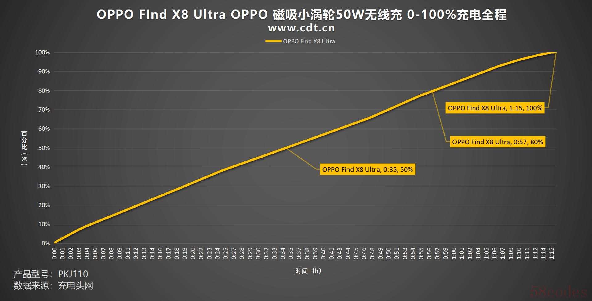 绘制出折线图,可以看出,OPPO 磁吸小涡轮50W无线充 为 OPPO Find X8 Ultra 充电至50%耗时35分钟,充至80%耗时57分钟,充至100%耗时1小时15分钟。