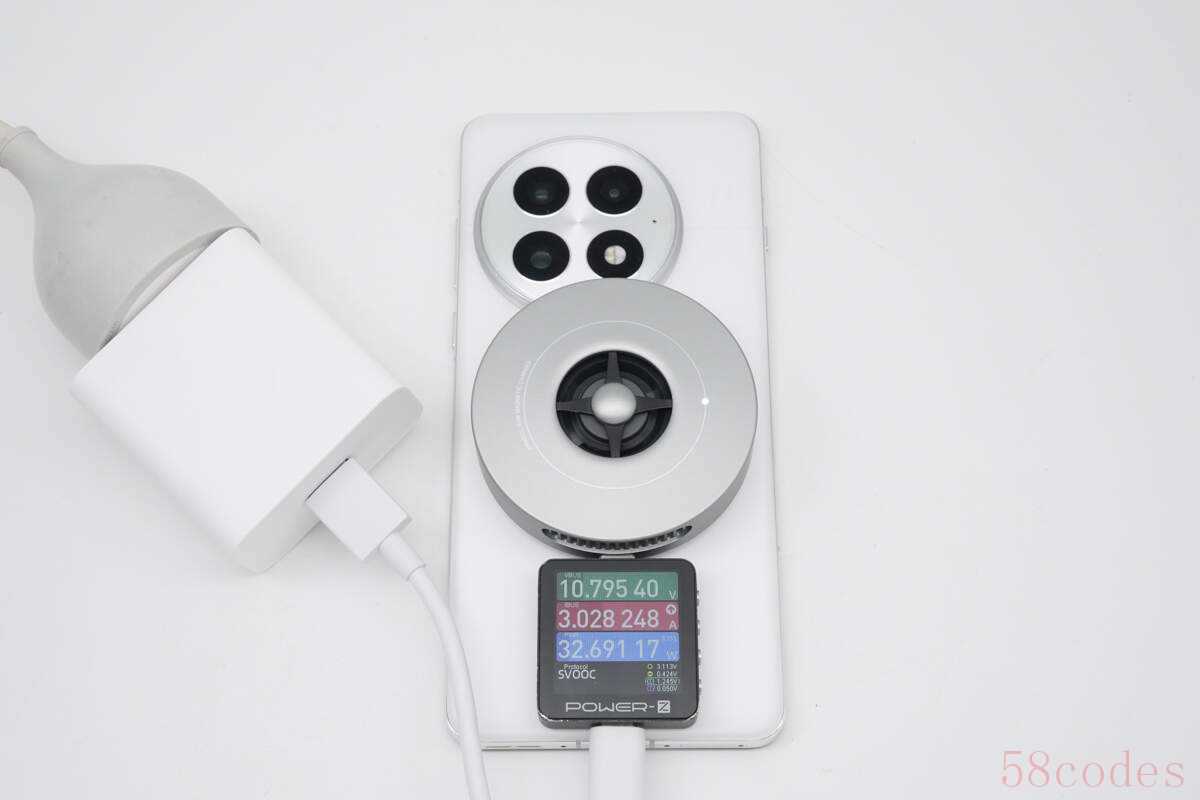 为 一加13 充电时,OPPO 50W 磁吸小涡轮无线充电器输出端功耗约为 10.80V 3.03A 32.69W。