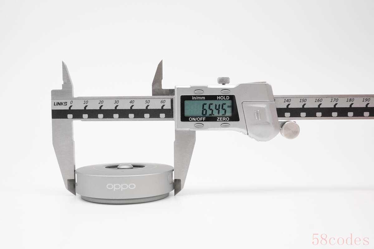 实测OPPO AIRVOOC 50W 磁吸无线充电器直径约为65.45mm。