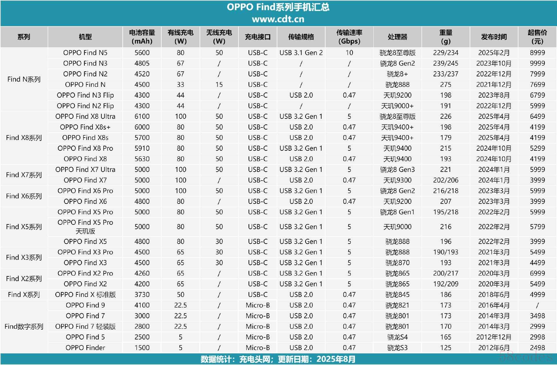 此次充电头网也汇总了Find系列的无线充电协议支持情况,可以看到从Find X3系列开始搭载30W无线充电,Find X5-Find X8系列则搭载50W无线充电(部分标准版不支持无线充电),而Find N初代为15W无线充电,时至今日的Find N5也拥有了50W无线充电。