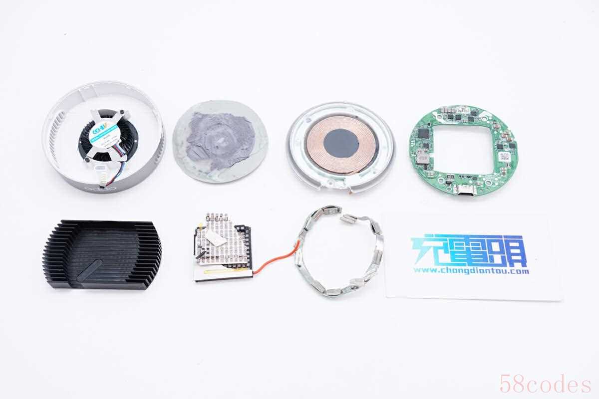 充电头网通过拆解了解到,OPPO AIRVOOC 50W 磁吸无线充电器采用了伏达半导体NU1718无线充电方案,搭配威兆半导体VS4620GEMC功率管进行无线充电以及功率级供电。使用拓尔微两款同步降压转换器TMI3244T和TMI3252T进行降压为风扇和制冷片供电。采用散热鳍片搭配风扇吹风散热,制冷片降温为手机长时间运行提供支持,整体设计合理,用料可靠。