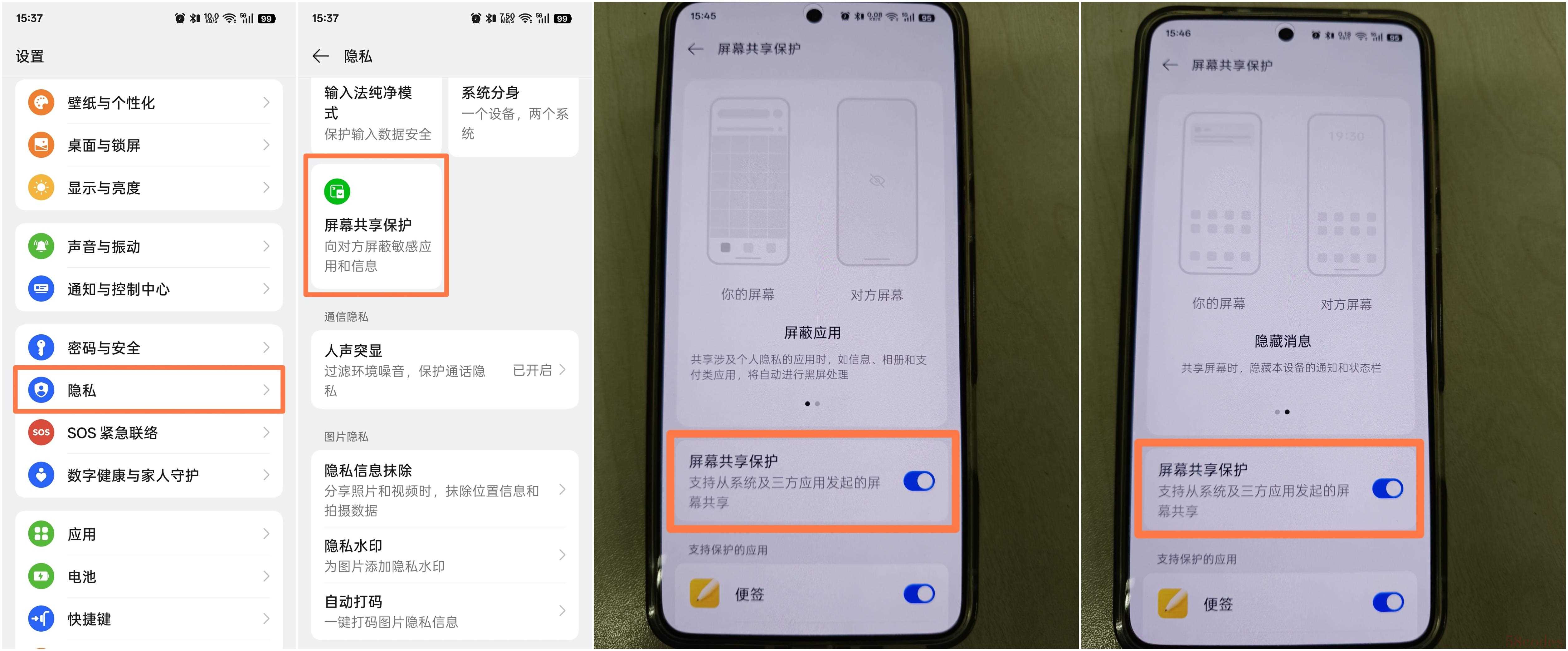 随着手机性能与功能的不断增强,逐渐成为联系生活和工作的枢纽。即便碰上出差,通常也无需大包小包带上电脑和演示设备,只需让对方准备一台支持无线投屏的设备即可开工。然而如今手机已普遍支持双卡双待,如果公司没有配备专门的工作手机,一般人普遍都「公私不分」。如果适逢在投屏演示时,有些亲朋戚友却恰好发些不合时宜的信息,轻则影响演示效果,重则可能改变在客户与同事间的「刻板印象」。如果信息涉及商业机密,还可能影响本次双方的谈判筹码。ColorOS 15搭载「屏幕共享保护」,当用户在投屏过程中误开涉及隐私信息的APP时,手机屏幕依然正常显示,投屏设备此时会变成黑屏,涵盖便签、电话本、钱包、日历、微信、相册、信息、文件管理以及常用的支付APP。当然系统也并非如此死板,如果投屏就是演示这些内容,也可以按APP单独开启或关闭。在全程演示的过程中,系统也会隐藏状态栏以及期间的通知。在兼容性上也做到「全面覆盖」,不仅支持系统本身的屏幕共享,就连从第三方APP发起也能达到相同效果,将隐私保护叠满甲,尽可能降低泄密的风险。