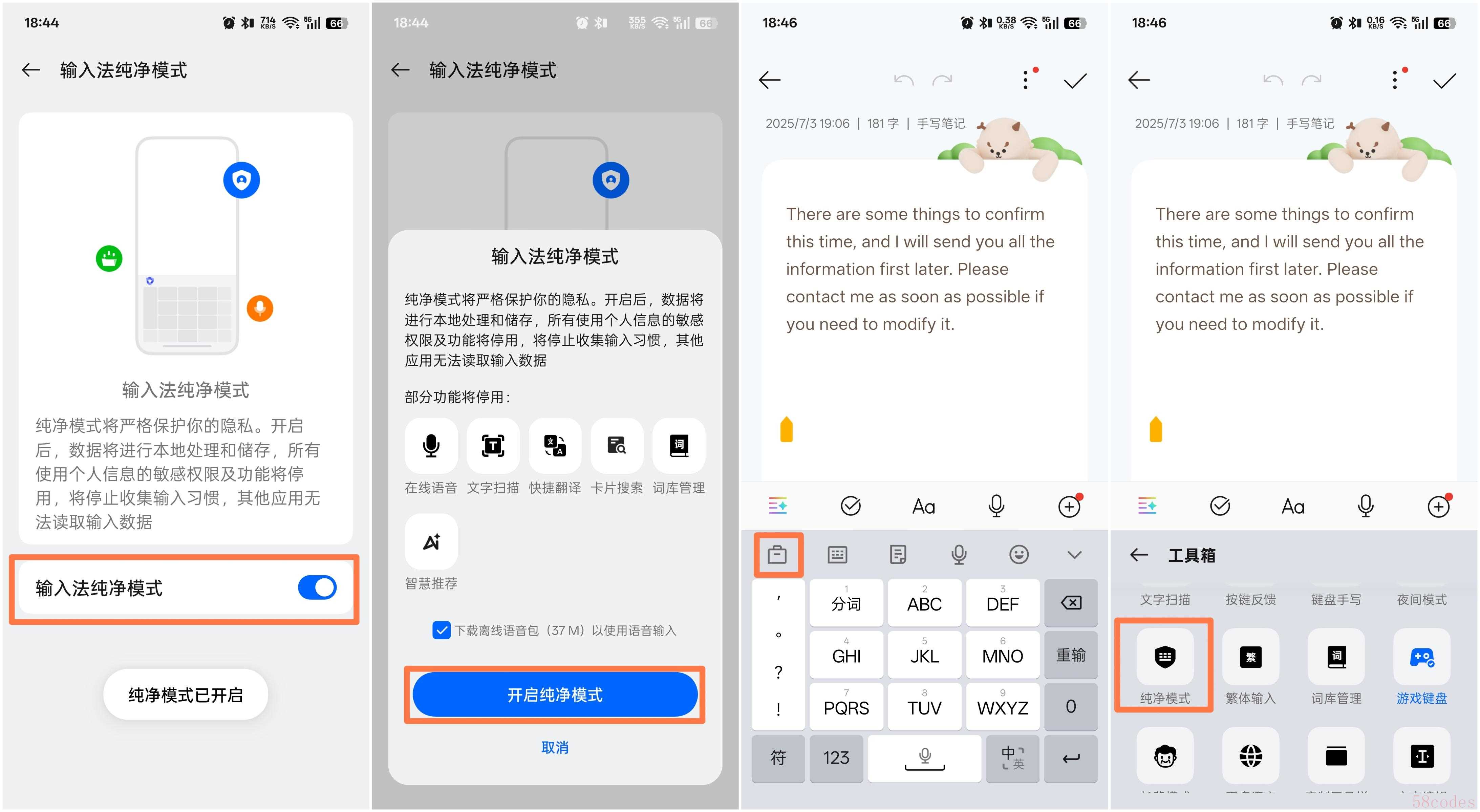 除了使用「剪贴板」「搬运」的过程中容易泄露隐私,使用某些不知名的输入法也有可能「中招」。如果对隐私安全比较看重,也可以在需要时开启ColorOS 15的「输入法纯净模式」。随后数据将进行本地处理和存储,停止根据收集的输入习惯优化程序,并通过停用在线语音、文字扫码、快捷翻译、卡片搜索、词库管理、智慧推荐等功能,以牺牲便捷的方式换取更高的安全保障。对于重度语音使用者,系统也通过「下载离线语音包」的方式提供「平替」。这项功能不仅通过「设置」开启,还能在输入过程中根据需要随时切换,尽可能在便捷与隐私中探索更好的平衡点。建议最好使用官方自带的输入法,既保留原有品牌的绝大部分功能,也在安全隐私上尽可能把好关,将防护buff叠满。