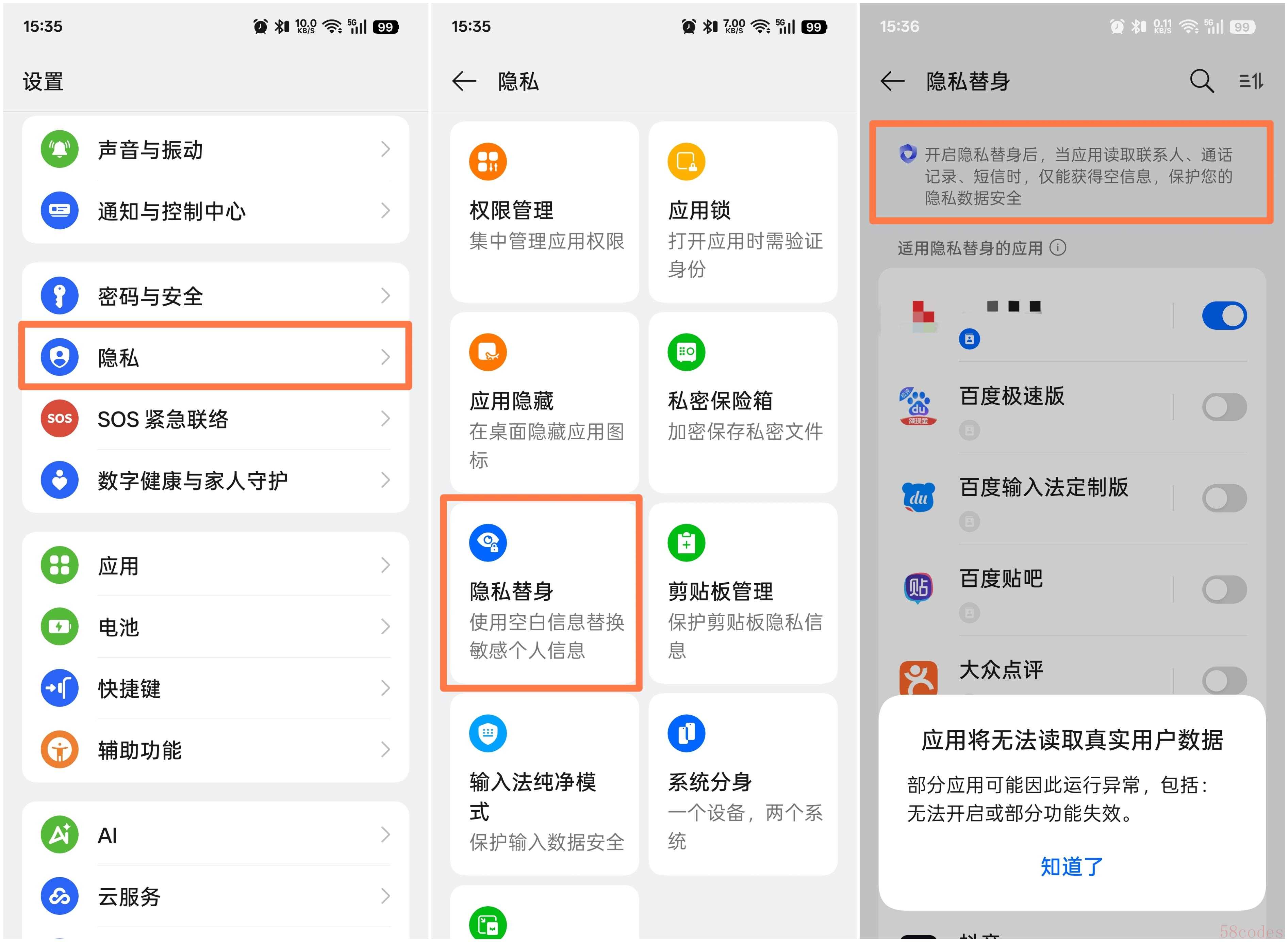 在如今手机全面接管衣食住行的快节奏生活,几乎没有一个系统能够大包大揽,还得靠众多第三方APP。在工信部的一再规范下,各APP开始遵循最少且必要的索权原则,尽管「不给便不让用」的情形大幅减少,但有些聪明的开始搞差异化竞争,以奖励的方式进行「你情我愿」的双赢交易,有些则采取诱导甚至强取的方式直接索要。作为普通用户,确实很难防范。ColorOS 15搭载「隐私替身」,开启后当APP读取联系人、通话记录、短信时,将会得到系统「特供」的空信息。为满足不同场景的使用需求,用户能根据不同的APP来授权,是「虚」是「实」全凭意愿。既照顾体验,也保留隐私,可谓实用的两全之策。