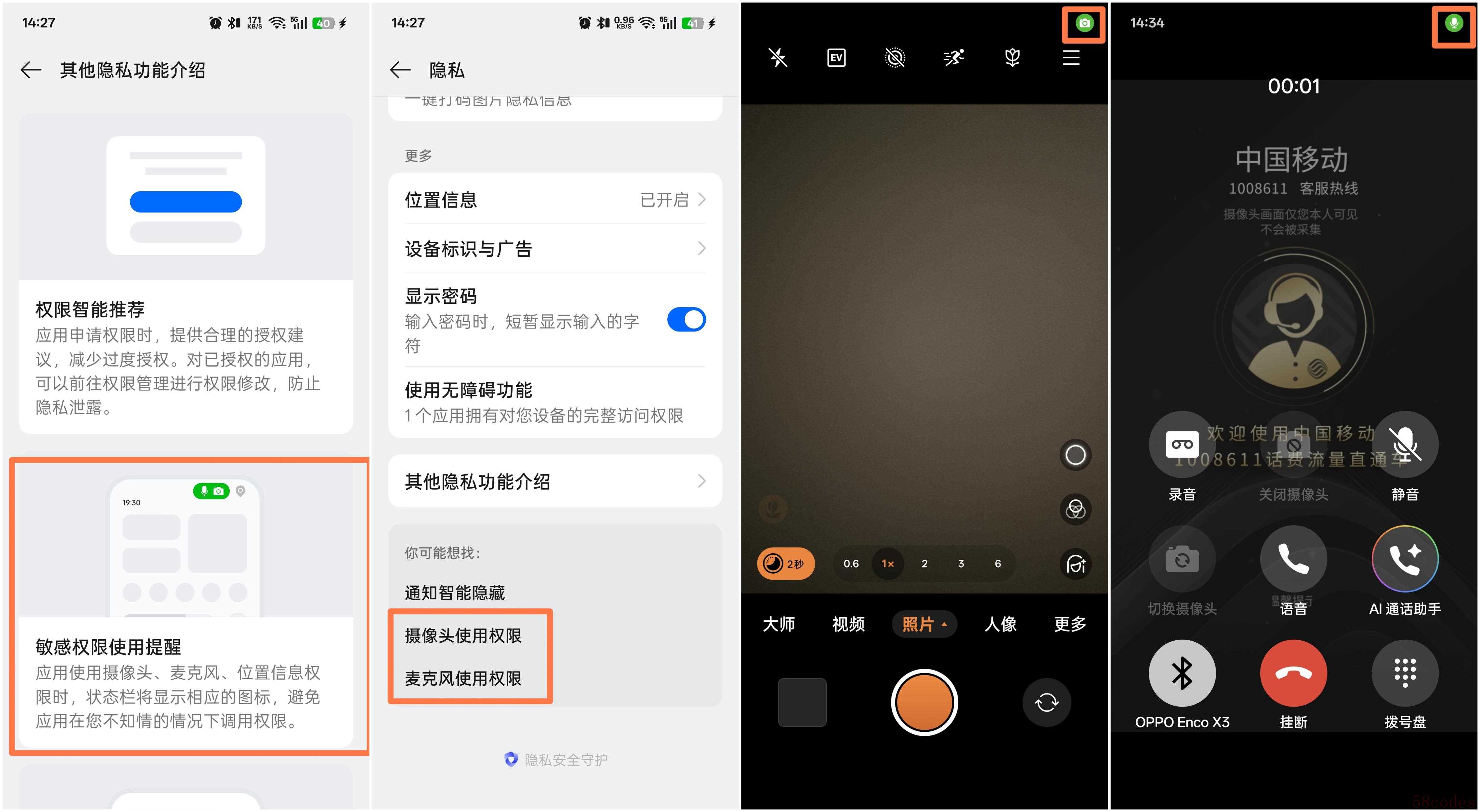 想当年伸缩摄像头流行的时候,平时无感需要时才出现的隐形设计自然是最大的卖点。更令人意外的是,当打开某些APP时,前置摄像头居然在用户没有「宣召」时自动升起。尽管APP厂商解释称只是因为索取权限引发的误会,但也为系统的隐私安全敲响警钟。ColorOS 15采取更严密的权限管控,无论是用户还是系统亦或是第三方APP调用,前置摄像头周边区域都会有显眼的光圈提醒。如果是长时间调用,屏幕右上角还会有摄像头图标常驻,三秒后会缩小成小绿点,既起到明显的提示作用,也不会因长时间刷存在感而影响体验。同理调用麦克风权限也有相同的机制,区别无非就是图标不同。如果参加的会议有更高的保密要求,也可以手动关闭摄像头、麦克风的权限,从系统层面隔绝被偷偷调用,而引发隐私信息泄露的风险。