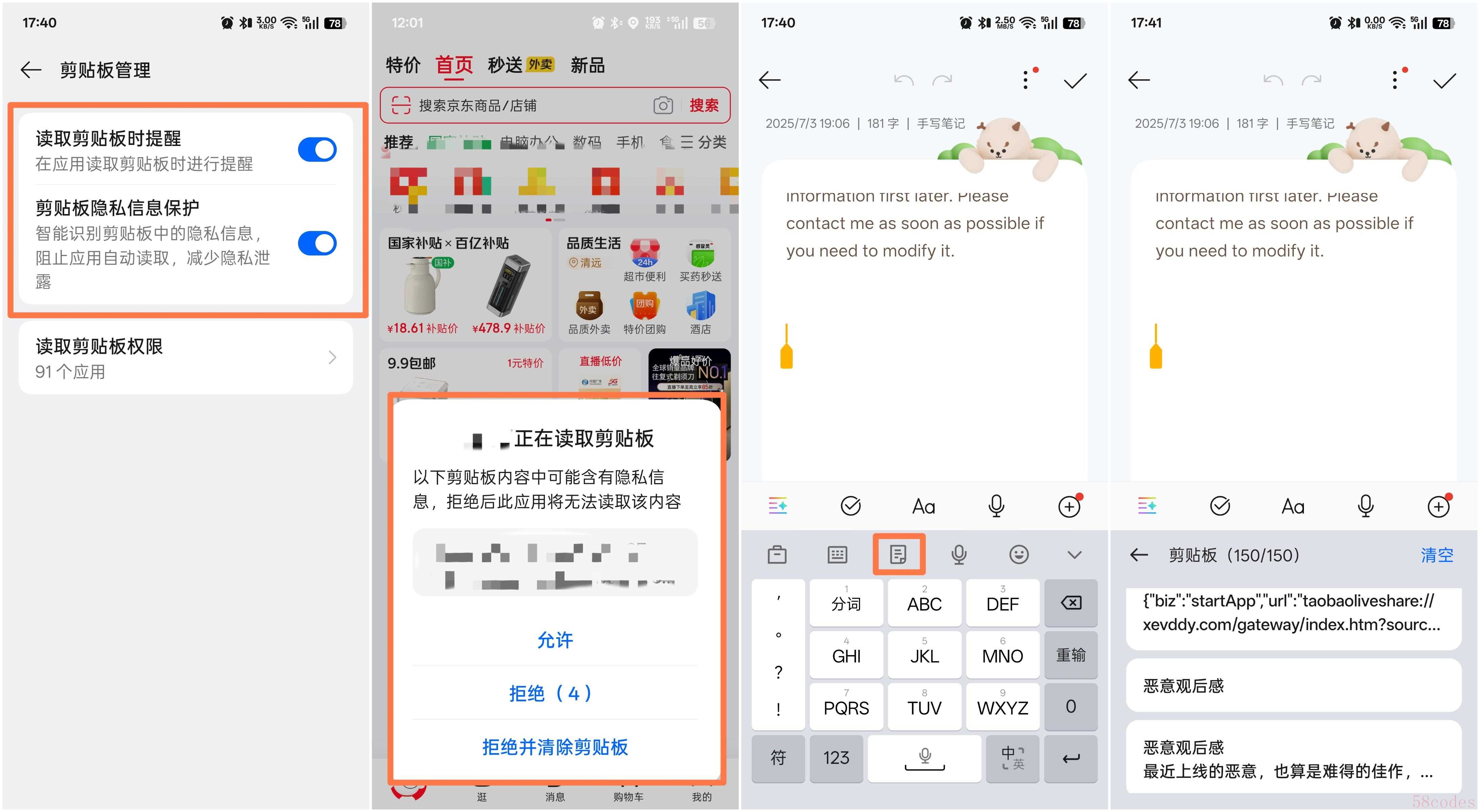 「剪贴板」是从电脑流转过来的功能,想当年Ctrl+C和Ctrl+V便是「搬运」的专属快捷键。如今将主战场迁移至手机,为尽可能提高输入效率,经常通过剪贴板「搬运」身份证、家庭住址、手机号码等隐私信息,有时甚至还向同事群发包含公司机密的通知。尽管使用时万分谨慎,但架不住某些「鸡贼」的APP,通过众多方式千方百计试图从残存数据中获取有用信息。ColorOS 15搭载「剪贴板管理」,通过智能识别剪贴板中的隐私信息,阻止无关应用的自动读取,从而减少隐私泄露的风险。与电脑只能存放一条记录不同,系统的剪贴板存放最多能存放150条数据,如果有多项「搬运」的需求,或者在搬运过程中不慎复制到其他无关内容,也能快速从历史记录中快速调取。如果想「雁过不留痕」,也能在事后手动清除。其实不少APP都借助剪贴板「过桥」传递数据,就算有留存信息也很快被刷掉。或许有小伙伴担心系统「监守自盗」,有ISO/IEC 27001、ISO/IEC 27701以及ioXt等多项国内外安全领域的权威认证背书,在使用上完全不用过多担心。