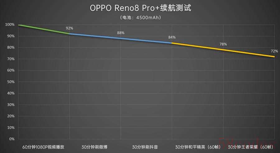 在实际的续航测试上,OPPO Reno8 Pro+在经过了三小时的使用后依然保持有72%的电量,而这一续航测试覆盖了一系列的娱乐场景,在日常的使用上已经算是比较重度的了,OPPO Reno8 Pro+的这一个续航属于是不错的水准。