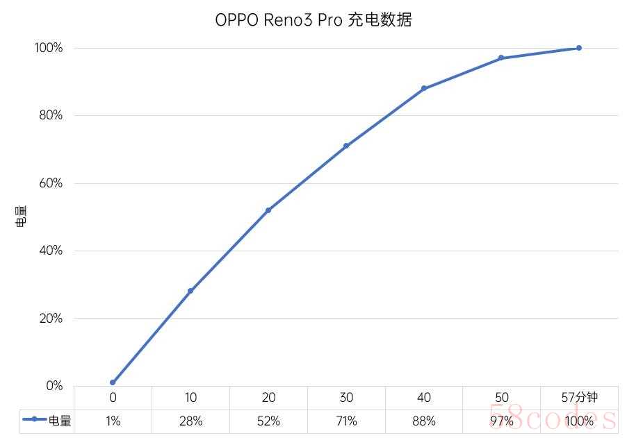 在使用 VOOC 闪充的情况下,OPPO Reno3 Pro 从 1% 充至 100% 仅花费 57 分钟。换言之,不到一个小时,手机电池就能完全充满。如果仅看全速充电阶段,Reno3 Pro 则是用 40 分钟充入了 88%的电量,充电效率极高。在时间比较紧的情况,OPPO Reno3 Pro 的 VOOC 闪充绝对能为用户带来幸福感。