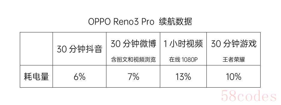聊过了手机的续航,我们接着说说OPPO Reno3 Pro的充电。对于用户来讲,耗电追求慢,而充电则是越快越好。OPPO Reno3 Pro 搭载了全新升级的 VOOC 闪充 4.0,支持最高 30W 的充电功率。下面,我们就通过一张充电数据表,看一看充满 OPPO Reno3 Pro 的 4025mAh 电池需要多久。