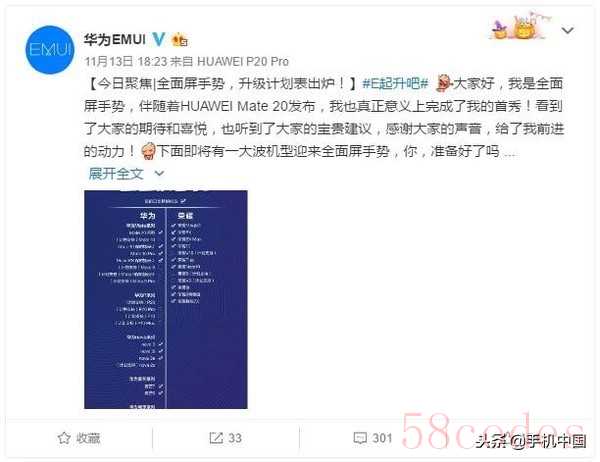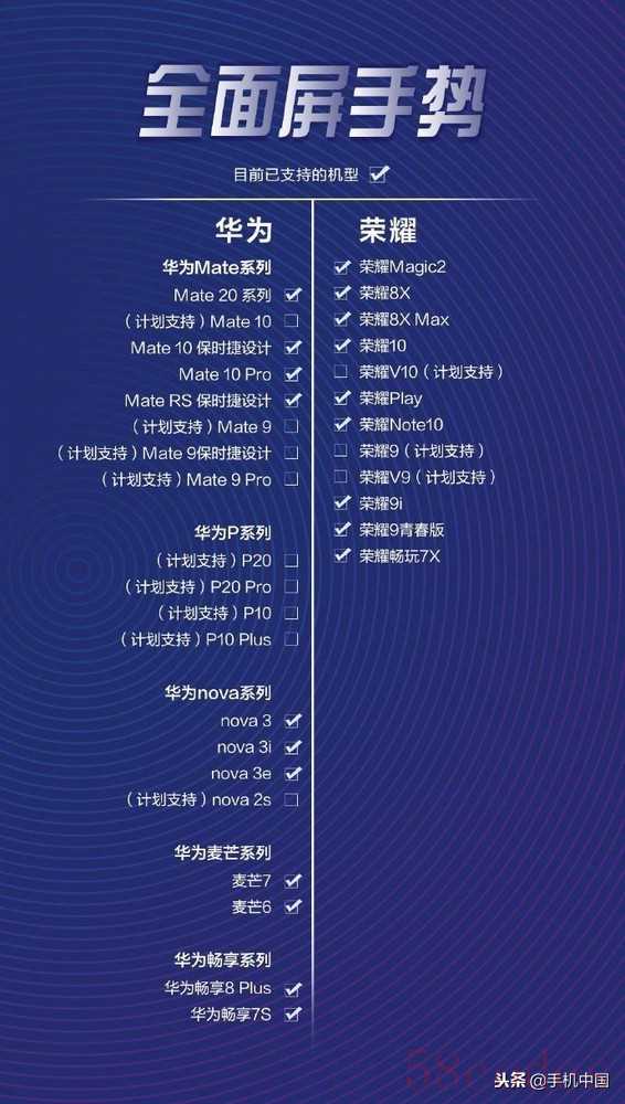 【手机中国新闻】11月13日,华为EMUI官方发布公告称,华为34款机型将陆续更新并支持全面屏手势,包括发布较早的华为Mate 9系列手机、华为P10系列手机、荣耀9系列手机、华为麦芒系列手机、华为nova 2s等,部分千元机也能享受到全面屏手势带来的强大功能。